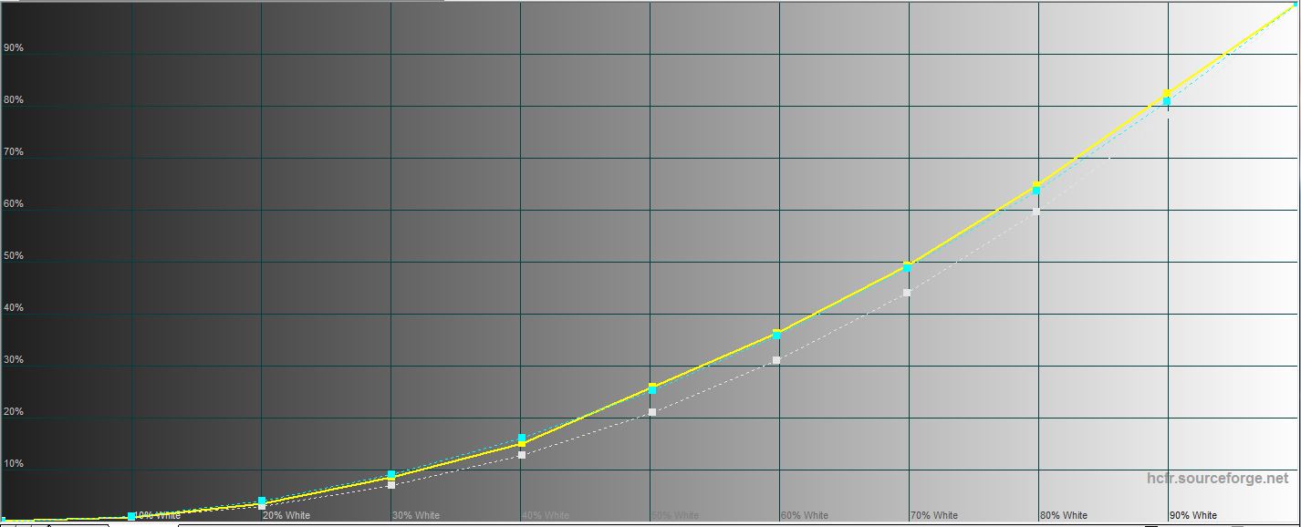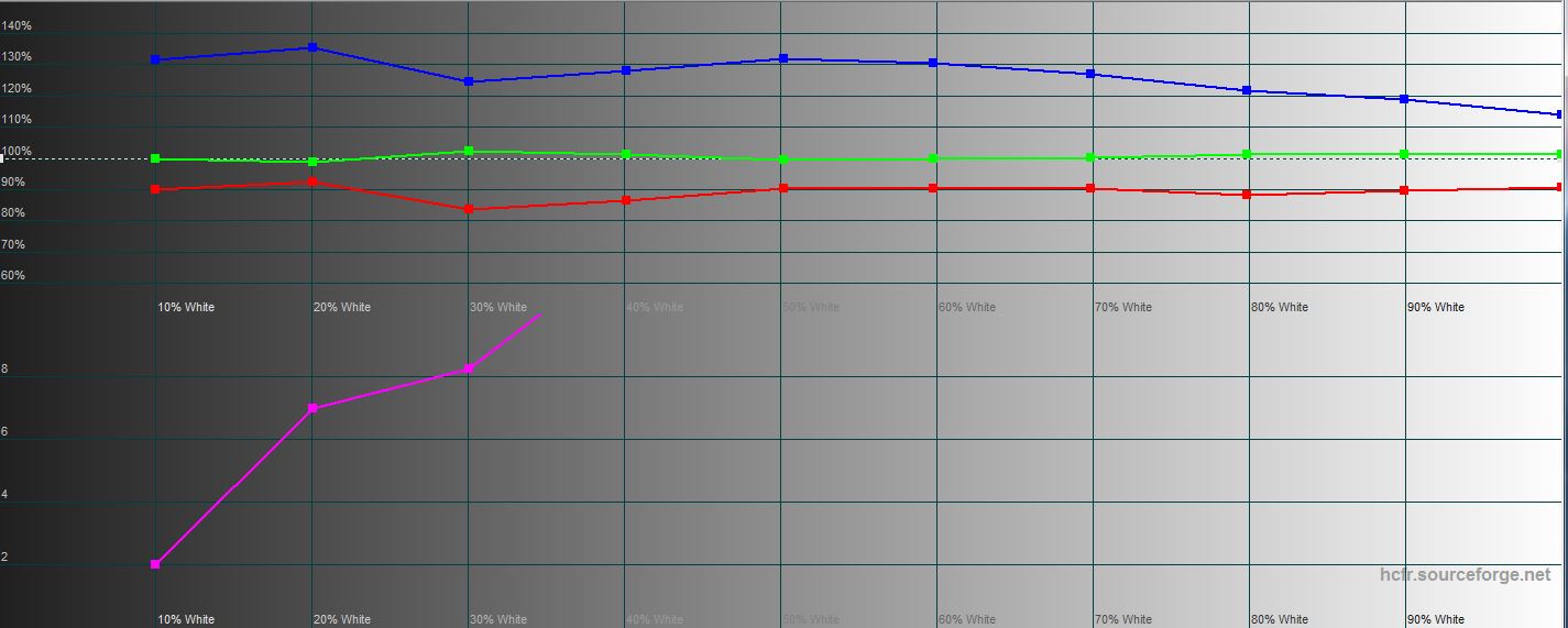 Pomiary wykazały, że ekran ma bardzo imponujące wskaźniki jasności i kontrastu. Maksymalna jasność wynosi 521,2 cd / m², jasność czarnego pola wynosi 0,208 cd / m², a kontrast statyczny to 2506: 1. Jednocześnie ekran jest dobrze skalibrowany. Zimne odcienie są wypaczone, ale bardzo małe, a gama kolorów jest zbliżona do przestrzeni kolorów sRGB: