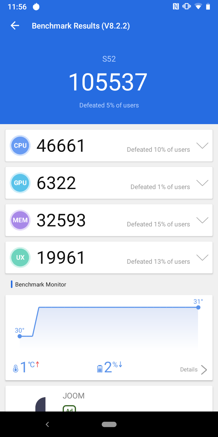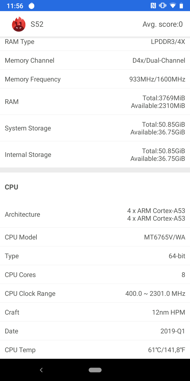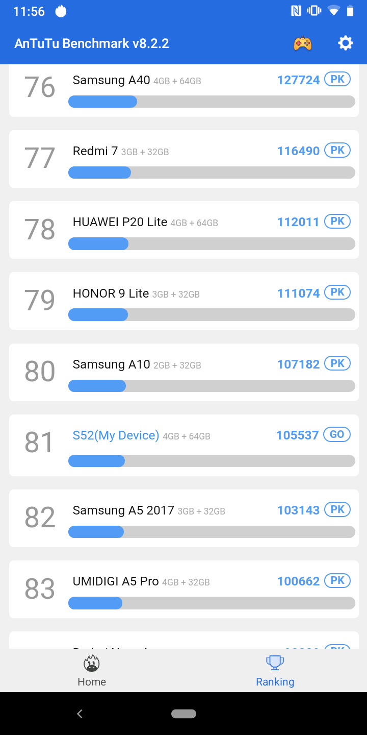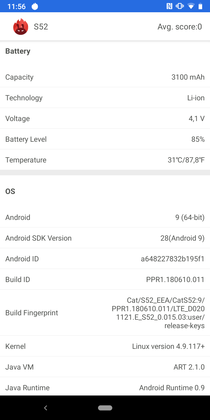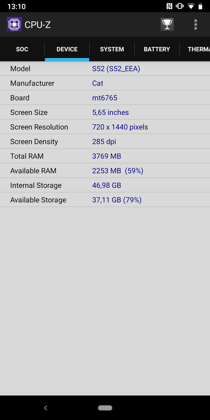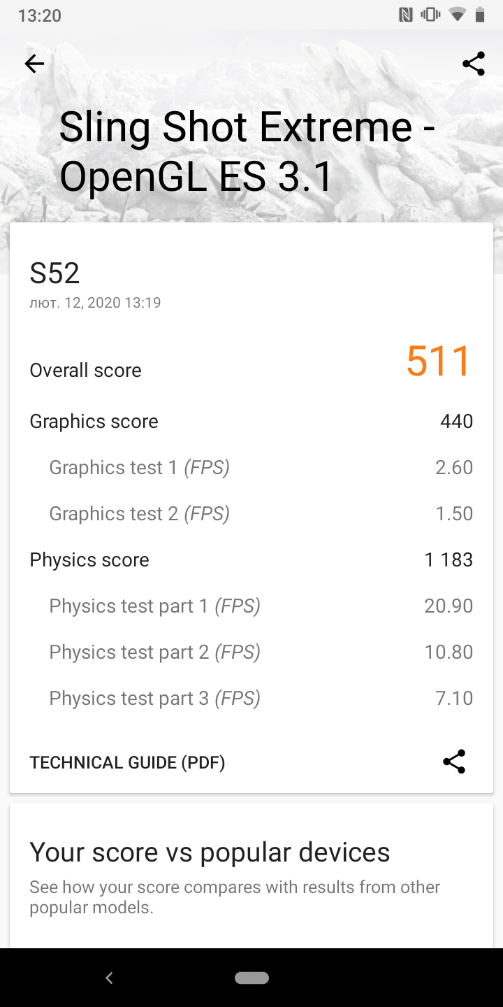 Żelazo w CAT S52 ma 12-nanometrowy procesor MediaTek Helio P35 (MT6765), który obejmuje 8 rdzeni Cortex-A53 o maksymalnej częstotliwości taktowania do 2,3 GHz oraz akcelerator graficzny PowerVR Rogue GE8320. Jest wystarczająca ilość pamięci (biorąc pod uwagę klasę smartfona): operacyjny - 4 GB, wbudowany - 64 GB, obsługiwane są karty pamięci do 512 GB. Pod względem wydajności wszystko jest dość skromne: aplikacje działają dobrze, interfejs nie zwalnia, chociaż trudno jest go nazwać błyskawicą. W testach syntetycznych wyniki są odpowiednie, raczej „budżetowe” za poziomem. Możesz także ogólnie grać w gry, ale najnowocześniejsze z ciężką grafiką mają minimalne ustawienia i niezbyt wygodną liczbę klatek na sekundę.