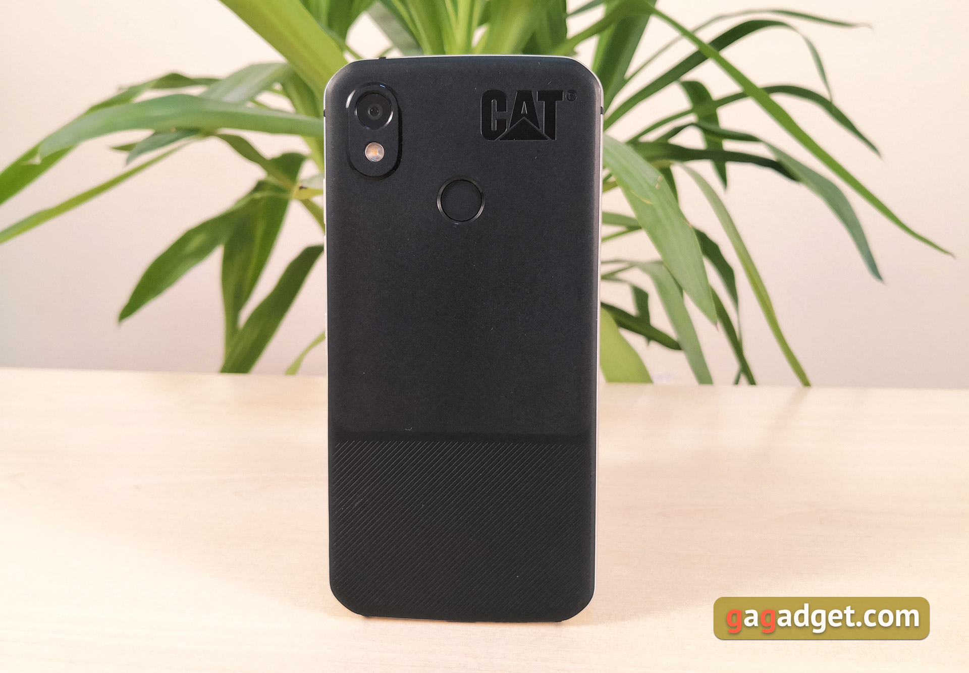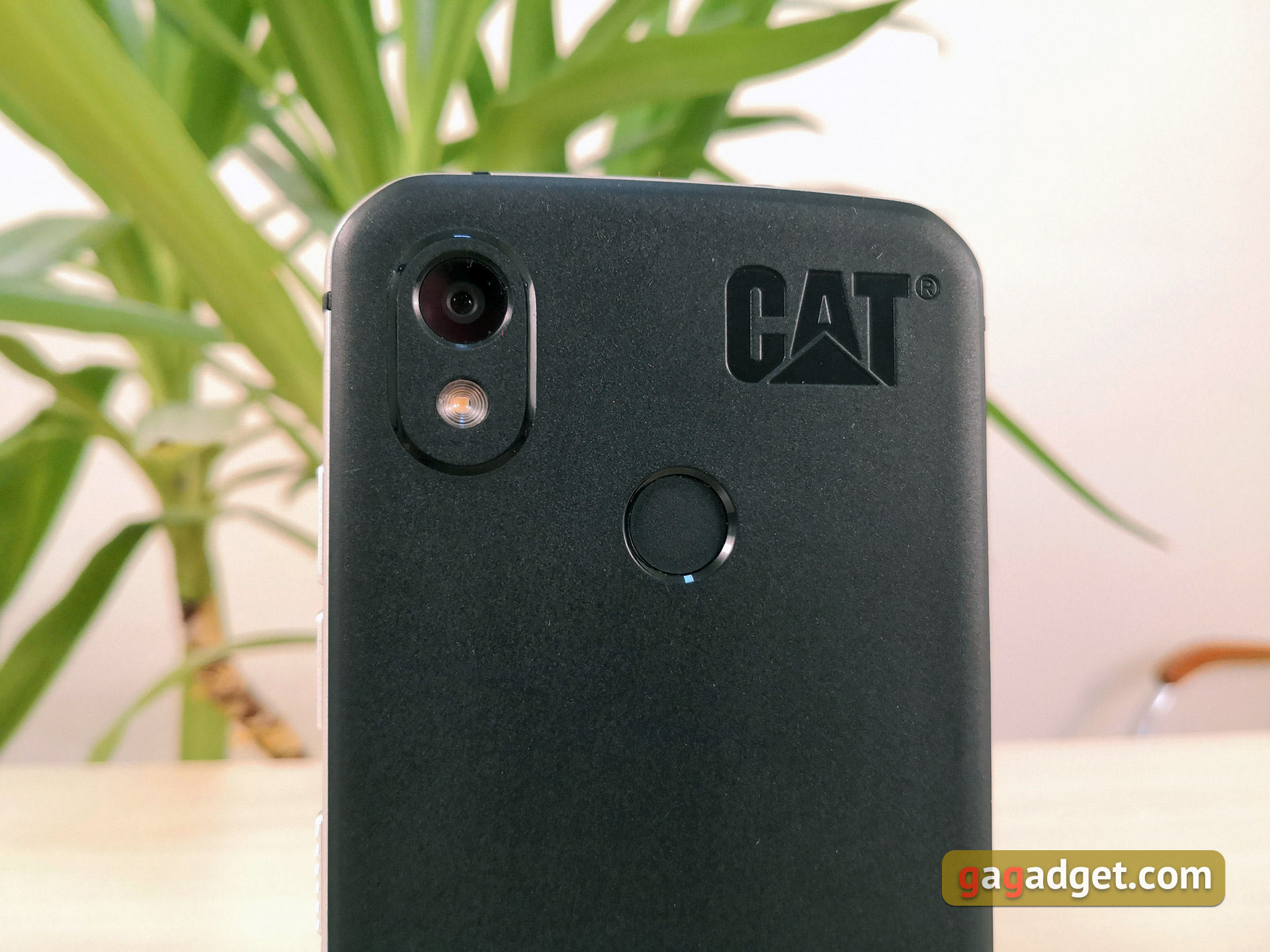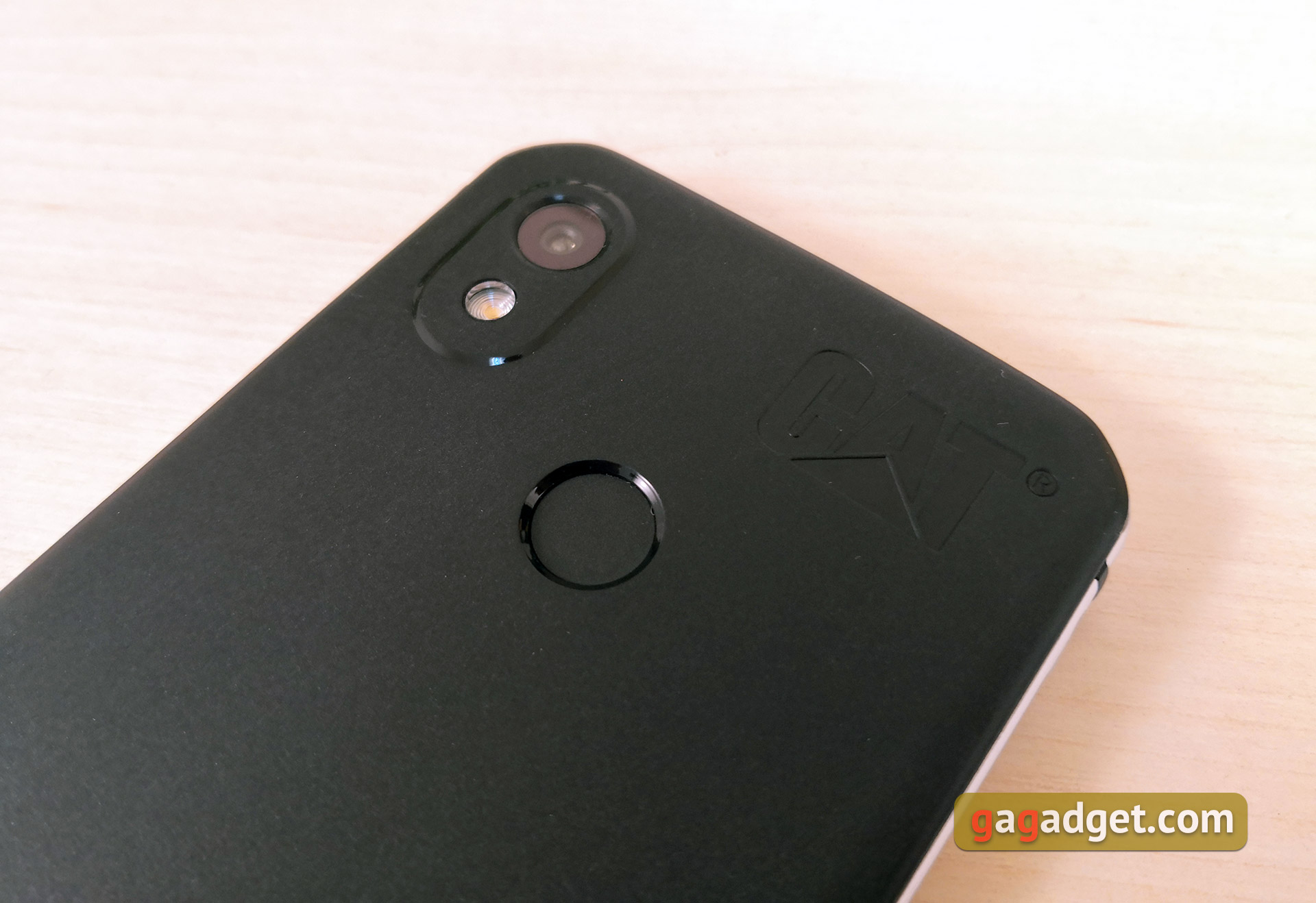 W górnej części tylnej pokrzywy znajduje się skaner linii papilarnych, wytłoczone logo CAT i pojedyncza kamera główna z lampą błyskową w lewym górnym rogu.