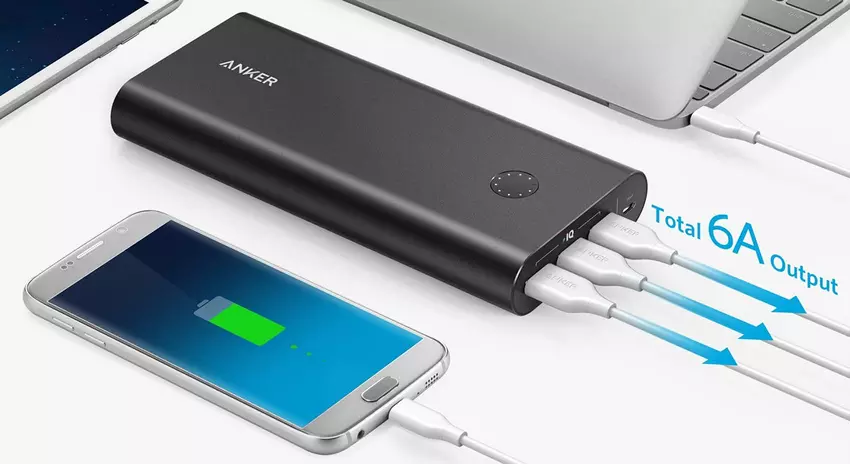 I wreszcie kolejny "dorosły powerbank" o pojemności 26 800 mAh. Jest to maksymalna pojemność, która pozwala na przewożenie akumulatora w samolocie bez żadnych ograniczeń. Anker PowerCore+ posiada trzy wyjścia USB, z których jedno obsługuje technologię Quick Charge 3.0. Pozostałe dwa dostarczają do 3A, a jeśli wykorzysta się kilka portów, całkowity prąd wyjściowy może osiągnąć do 6A. Z tego możemy wywnioskować, że model ten jest przeznaczony przede wszystkim do ładowania gadżetów mobilnych. Podłączenie do laptopa wymaga szybszego standardu Power Delivery, jak wspomniany ZMI 10.