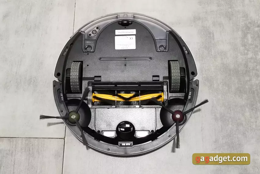 Na dole robota znajduje się wiele interesujących rzeczy. Po bokach znajdują się dwa duże gumowane koła napędowe, z przodu - małe koło z możliwością obrotu o 360 °. Po bokach znajdują się pola kontaktowe do ładowania. Na obwodzie umieszczono pięć czujników, aby zapobiec spadnięciu ze shodów (jeden z przodu i dwa z każdej strony). Z tyłu robota znajduje się platforma do mocowania tkaniny do czyszczenia na mokro. Niemal pośrodku znajduje się otwór ssący i wyjmowana szczotka główna.