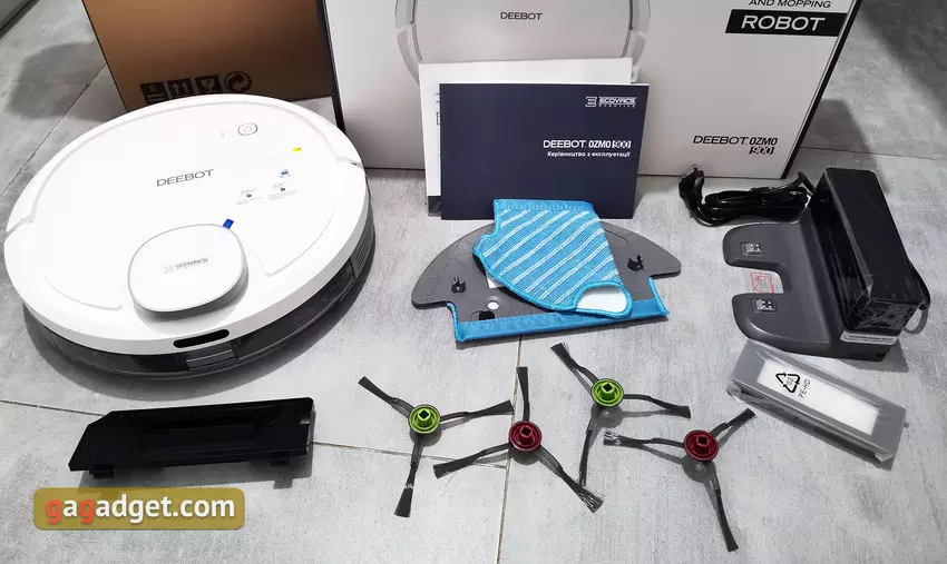 Ecovacs DEEBOT OZMO 900 jest dostarczany w podwójnym pudełku. Zewnętrzne - z „pakowalnego” żółtego kartonu, wewnętrzne - z nadrukiem i podstawowymi informacjami o gadżecie. Zestaw zawiera sam robot odkurzacz, stację ładującą, główną szczotkę (zainstalowaną), moduł bezpośredniego zasysania, dwa zestawy szczotek bocznych (4 sztuki), zapasowy filtr do pojemnika na kurz, ściereczkę do czyszczenia na mokro (2 sztuki), wyjmowany panel do mocowania, narzędzia do czyszczenia i instrukcję.