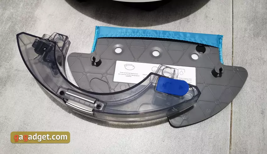 Zbiornik na wodę jest przezroczysty, z uchwytem i dwoma zaworami: do dostarczania wody podczas czyszczenia i do nalewania. Na zdejmowanej platformie znajduje się rzep do mocowania mikrofibry i dwie plastikowe klipsy do przymocowania do zbiornika.