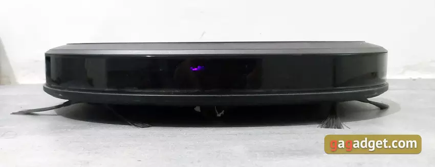 Najciekawsze jest na dole gadżetu. Po bokach są dwa duże gumowane koła, którymi napędza się DEEBOT OZMO Slim10. Z przodu - mniejsze koło, ale może obracać się o 360 °. Po bokach znajdują się pola kontaktowe, którymi robot jest ładowany ze stacji dokującej. Z przodu i po bokach zainstalowane są trzy czujniki, które zapobiegają spadnięciu robota ze schodów. Pośrodku znajduje się bezpośrednio otwór ssący, a z tyłu platforma, na której zamocowana jest mikrofibra do czyszczenia na mokro.