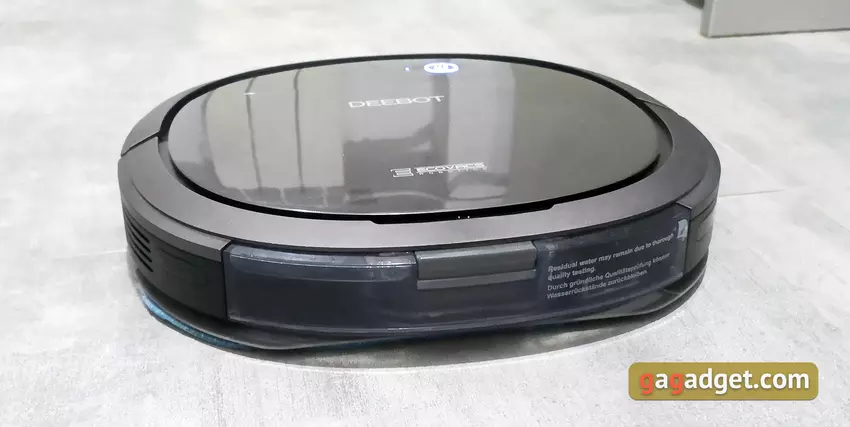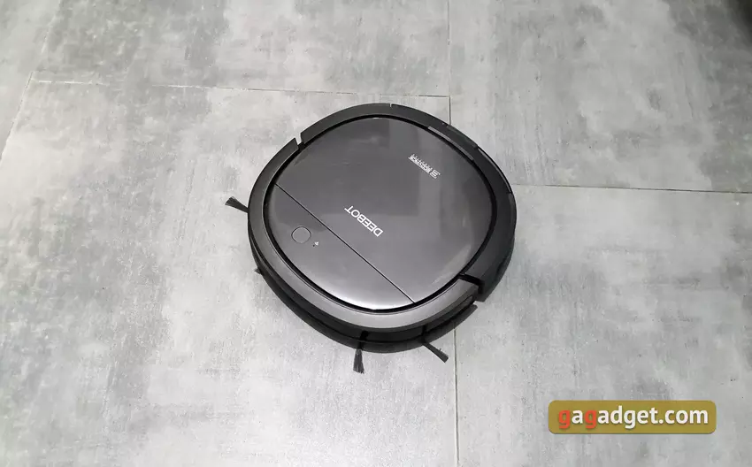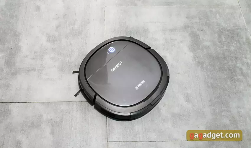 Robot wykonany jest głównie z ciemnoszarego plastiku, błyszczącego i matowego. Wygląda bardzo przyzwoicie, a jednocześnie spokojnie i neutralnie. Na górnej pokrywie znajdują się logo Ecovacs i DEEBOT, duży przycisk zasilania z wbudowaną diodą LED i symbol połączenia bezprzewodowego, również z diodą LED. Dioda LED na przycisku zasilania działa jako wskaźnik działania, ładowania, rozładowanego akumulatora i wszelkich błędów (miga na czerwono w dwóch ostatnich przypadkach).