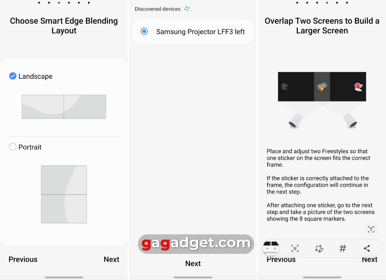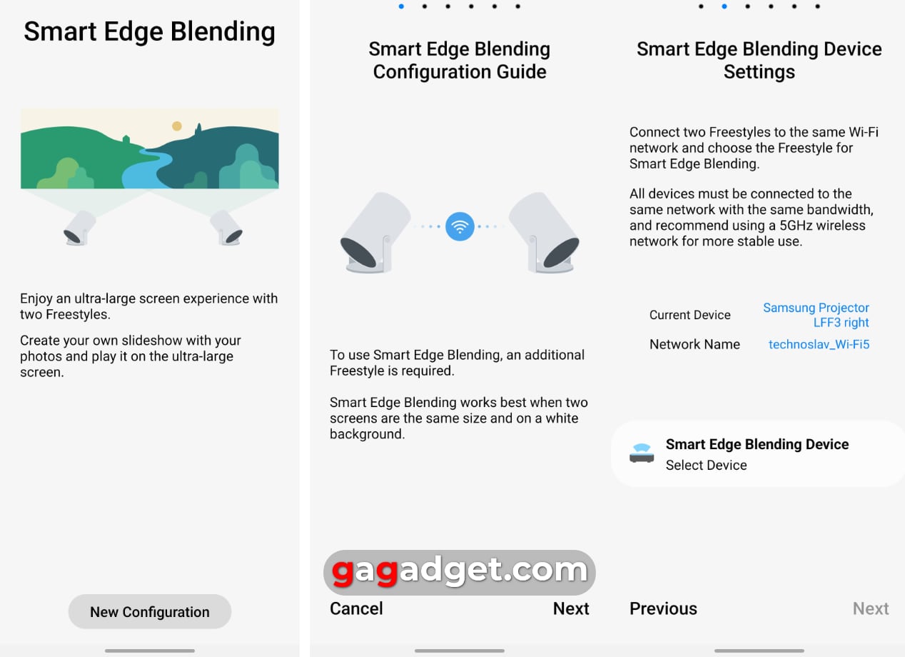 Po podłączeniu projektora w aplikacji SmartThings pojawia się nowa pozycja Smart Edge Blending, która odpowiada za konfigurację dwóch urządzeń.