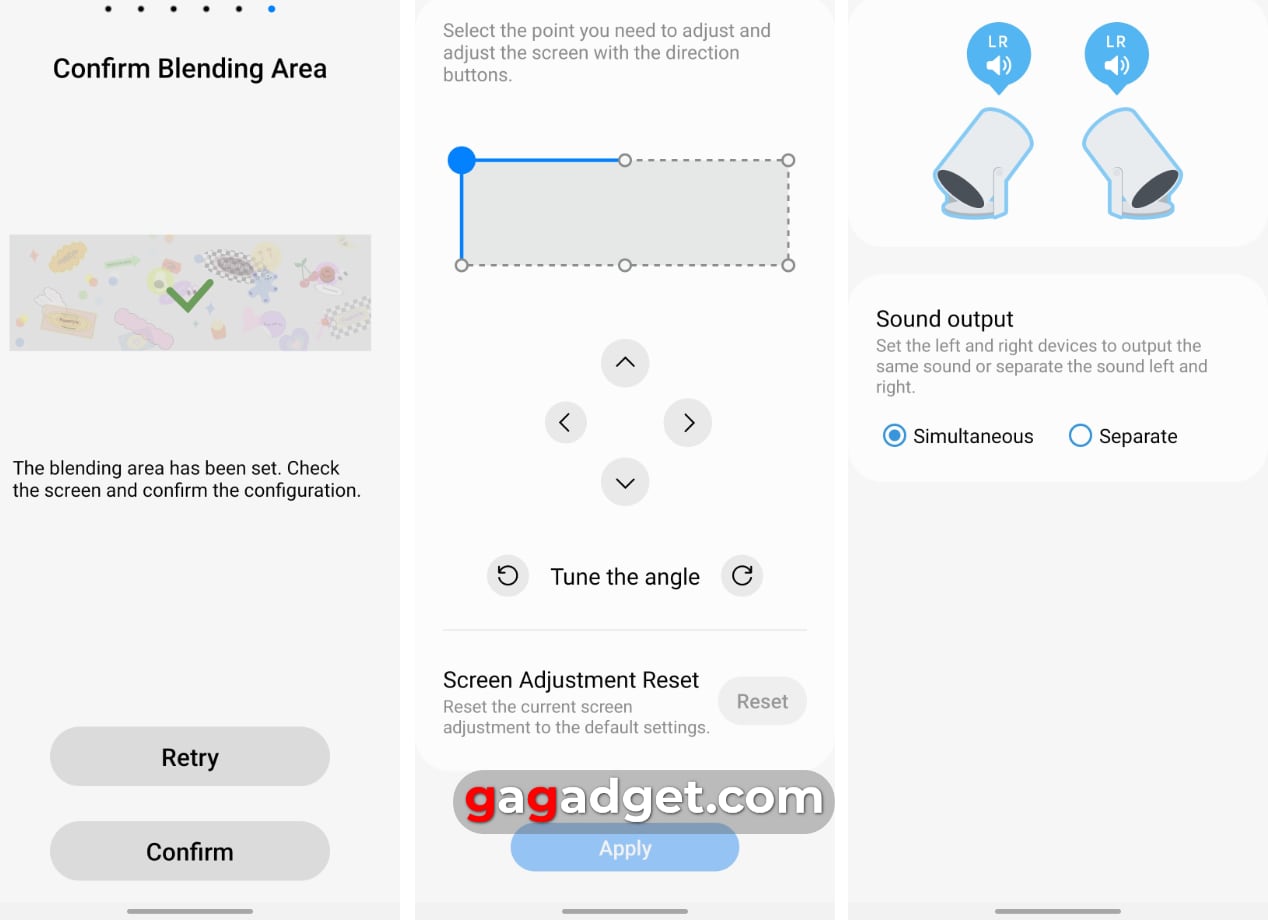 Jeśli algorytm jest zadowolony z obrazu, pojawi się ekran zatwierdzenia. Następnie można opcjonalnie nieco skorygować wspólny obraz (ja po prostu nie musiałem) i wybrać sposób kierowania dźwięku do projektorów - osobno dla każdego lub utworzyć parę stereo z ich głośników. Jak widać, wszystko okazało się proste i zadziałało za pierwszym razem (oby zawsze tak było z nowymi technologiami i funkcjami).