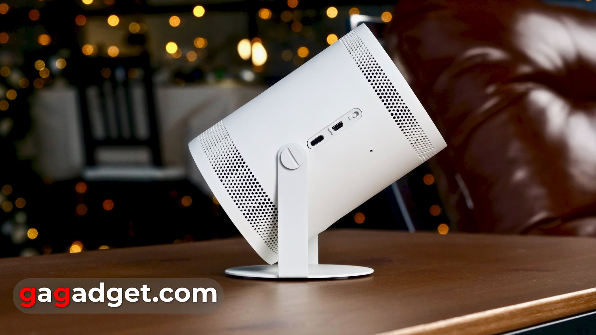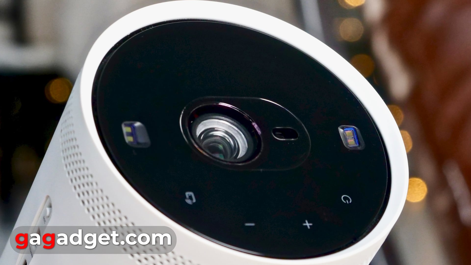 Oczywiście nie zniknęły inne zalety poprzednika, które pozwoliły mu zastąpić kilka gadżetów: przenośny głośnik z dookólnym dźwiękiem oraz lampka nocna z różnymi trybami i kolorami. Oprócz obsługi pakietu Smart TV, który otwiera łatwy świat usług strumieniowania wideo, dostępny jest ciekawy tryb Ambient do tworzenia przytulnej atmosfery lub odwrotnie, dekorowania głośnej imprezy. Dostępność dodatkowych akcesoriów - kolorowych skórek (osłon na korpus), etui ochronnego i markowej baterii - pozwala na pracę projektora w trybie offline i zabranie go ze sobą w plener. Główną technologiczną magią tego przenośnego projektora, która wyróżnia go na tle konkurencji, jest automatyczna regulacja obrazu, taka jak ostrość lub kompensacja zniekształceń trapezowych, gdy kąt nachylenia urządzenia jest przechylony. Sprawia to, że jest bardzo wygodny w użyciu i jest w pełni zgodny z ideą projektora, który nie powinien być przywiązany do jednego miejsca. W każdej chwili można skierować go na inną ścianę pomieszczenia lub nawet sufit, bez żadnego dyskomfortu dla użytkownika. Właściwie, jeśli nie interesują was dalsze szczegóły, to na tym można by zakończyć tę recenzję, ale zapewne po nie tu przyszliście.