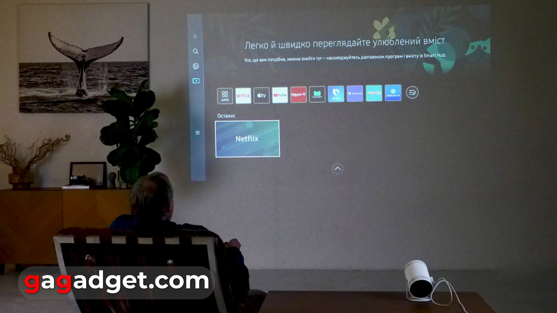 Menu projektora będzie znane wszystkim użytkownikom telewizorów Samsung. Jest to interfejs Smart TV oparty na systemie Tizen ze wszystkimi zaletami sklepu z aplikacjami (Netflix, Amazon Prime, Apple TV i lokalne usługi wideo SweetTV lub Megogo są wstępnie zainstalowane) oraz możliwościami integracji i zastrzeżonym systemem sterowania inteligentnym domem SmartThings. Ogólnie rzecz biorąc, czy znasz wiele przenośnych projektorów z obsługą Smart TV? Nowoczesne interfejsy starają się zachować prostotę i ukryć ustawienia, które są używane raz w miesiącu i pozostawić wszystko, co musi być używane codziennie w polu widzenia. Taki właśnie jest interfejs tego projektora - wszystko jest przejrzyste i wygodne. Nawet jeśli nigdy wcześniej nie korzystałeś z telewizora Tizen, nie musisz przyzwyczajać się do elementów sterujących. Ale jeśli już to zrobisz, możesz zacząć konfigurować scenariusze SmartThings lub ręczną korekcję obrazu lub bawić się różnymi trybami obrazu (nawiasem mówiąc, nie są one ukryte głęboko w dżungli menu).