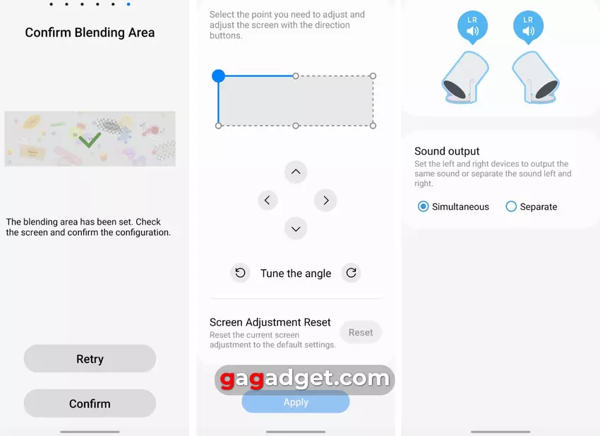 Jeśli algorytm jest zadowolony z obrazu, pojawi się ekran zatwierdzenia. Następnie można opcjonalnie nieco skorygować wspólny obraz (ja po prostu nie musiałem) i wybrać sposób kierowania dźwięku do projektorów - osobno dla każdego lub utworzyć parę stereo z ich głośników. Jak widać, wszystko okazało się proste i zadziałało za pierwszym razem (oby zawsze tak było z nowymi technologiami i funkcjami).