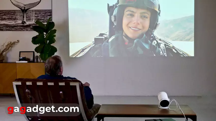 Jeśli chodzi o dźwięk, możliwości przenośnego projektora nie są zbyt duże, ale bohater recenzji pokazuje dokładnie to, czego się od niego oczekuje - wystarczająco mocny dźwięk, aby wygodnie oglądać film w pomieszczeniu i z marginesem głośności. Oczywiście w trybie głośnika audio dźwięk dookólny pozwala umieścić urządzenie na środku pokoju i słyszeć wszystko z dowolnej strony lub odległości - po prostu nie ma martwych punktów dla dźwięku. Ponadto akustyka projektora obsługuje dźwięk adaptacyjny (w tym celu na obudowie znajdują się dodatkowe mikrofony), co pozwala automatycznie zwiększyć głośność, gdy w pomieszczeniu pojawiają się głośne dźwięki. Wraz z obsługą HDR 10+ oddaje to pewien poziom technologiczny, który odpowiada pojęciu "nowoczesności" urządzenia.