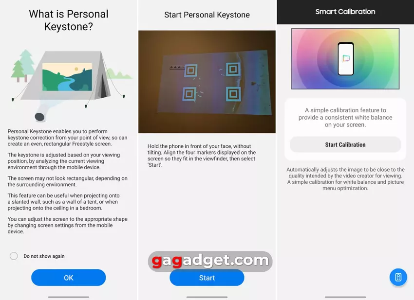 Co jeszcze można zrobić z aplikacją? Przeprowadzić automatyczną kalibrację obrazu. Lub skonfigurować projektor do pracy z ekranem w niestandardowych warunkach, na przykład podczas korzystania z niego na zewnątrz.