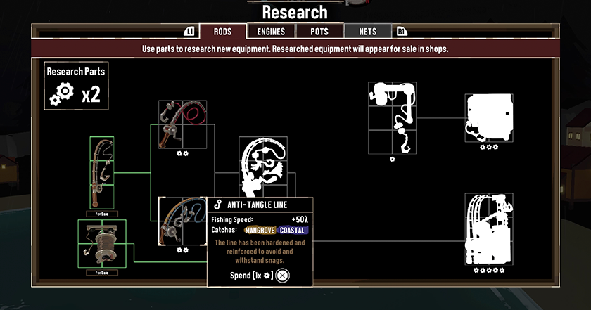 Zebraliśmy trzy części zamienne, wydaliśmy je na otwarcie nowej wędki, kupiliśmy ją i tak w kółko. Gra nie wymaga jednak spędzania godzin na zbieraniu części czy oszczędzaniu pieniędzy. Pod koniec mojej rozgrywki odblokowałem prawie wszystkie najlepsze narzędzia i nie poświęciłem na to zbyt wiele czasu.