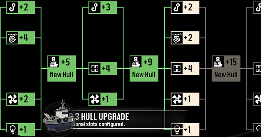 Oprócz narzędzi, możemy również ulepszać samą łódź. Otwiera to nowe miejsca w ekwipunku na wędki, silnik i miejsce do przechowywania ryb. Aby ulepszyć łódź, nie potrzebujemy już części zamiennych, ale drewna, płótna i starych silników. W wodzie jest ich naprawdę sporo i nigdy nie zdarzyła mi się sytuacja, w której przez dłuższy czas nie mogłem znaleźć jakiegoś przedmiotu. Gra nie "dusi" nas tymi elementami, ale czyni z nich przyjemny bonus.