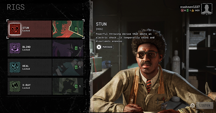 W bazie znajdują się jednak trzy postacie, które chętnie (i za walutę) uczynią cię lepszym. Pierwszą z nich jest Cornelius Noakes. Jest on inżynierem i sprzedaje kilka gadżetów. Możesz na przykład kupić gadżet, który zatrzymuje wroga na pewien czas, pozwalając tobie i twoim przyjaciołom na ponowne rozmieszczenie. Możesz też kupić urządzenie, które przywraca zdrowie wszystkim wokół ciebie. W sumie są 4 takie gadżety i byłoby miło, gdyby każdy w twojej firmie kupił inny, ponieważ możesz nosić przy sobie tylko jeden. Jednocześnie każdy gadżet może być dalej ulepszany, aby otworzyć nowe możliwości.