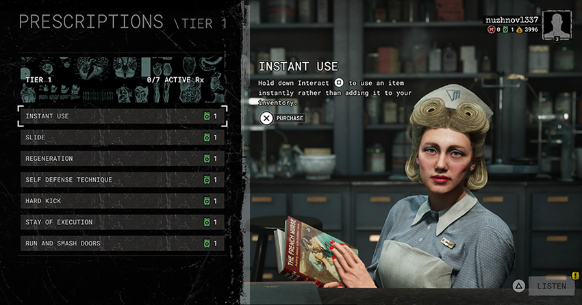 - Strzykawka - przywraca partnera do życia, jeśli zginął. Kiedy grasz sam, zamiast strzykawki będą pigułki, które musisz natychmiast wypić - doda to +1 szansę na odrodzenie.