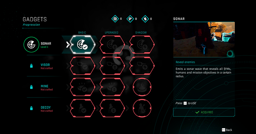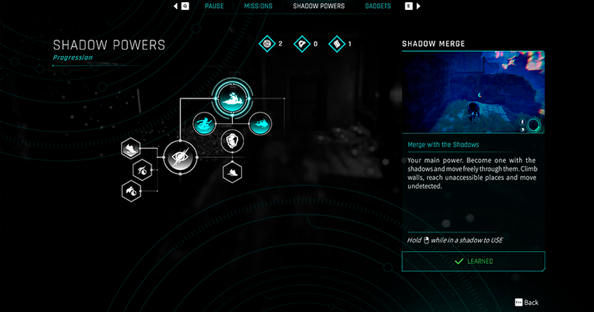 Co jeszcze jest poza możliwością przemiany w cień? Dobre pytanie i mam na nie odpowiedź. Gracz podczas przejścia może zdobyć kilka gadżetów. Po pierwsze, otrzymamy skaner, który przeskanuje okolicę i podświetli wszystkich wrogów w pobliżu. Będziesz go używał najczęściej.