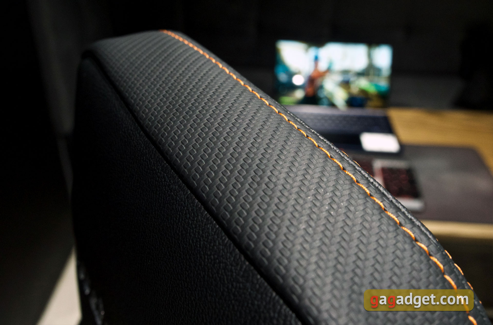 Otrzymaliśmy „klasyczne” czarne krzesło z pomarańczowymi akcentami w postaci opóźnienia. Fotel jest prawie w całości tapicerowany miękką sztuczną skórą klejoną DuraXtra, która ma wysoką odporność na ścieranie, nie boi się zarysowań i plam. Podobnie jest w przemyśle motoryzacyjnym.