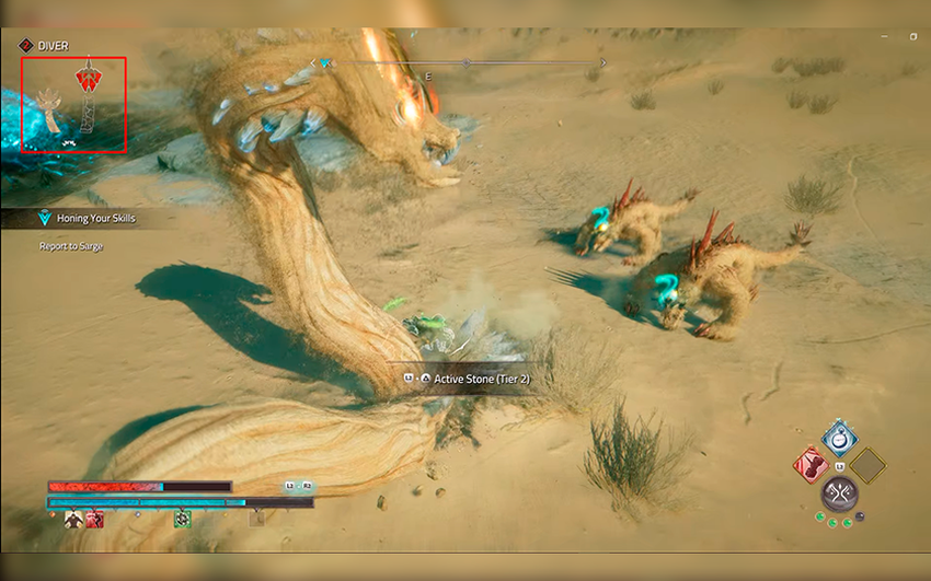 W przypadku dużych wrogów działa system "części". Aby wygrać, musisz zaatakować specjalne obszary. Na przykład, krab piaskowy ma głowę i dwa pazury. Ekran z boku zawsze pokazuje te strefy i ilość zadanych obrażeń. Są żółte i czerwone części. Jeśli strącisz wszystkie czerwone części, stwór automatycznie zginie. Jedyną rzeczą, która nie jest jasna w tym systemie, jest to, że jeśli strącisz warunkowy pazur kraba, nadal będzie nim atakował. Teoretycznie powinno to działać jak w serii Horizon, gdzie system jest bardzo podobny, a jeśli strącisz część ciała maszyny, nie będzie ona mogła jej użyć, ale ten punkt nie został w pełni rozwinięty.