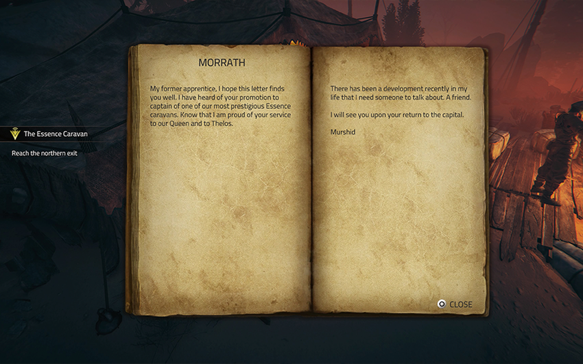 Nasz bohater postanawia się jednak nie poddawać, tylko zebrać wokół siebie małą grupkę i zacząć negocjować lepsze warunki z Morrathem, dowódcą karawany. Morrath, zgodnie z wszelkimi prawami gatunku, okazuje się równie okrutny co Talos i proponuje naszemu bohaterowi odnalezienie złodzieja, który ukradł mu ważną rzecz poza obozem, a wtedy, być może, dojdzie do jakiegoś dialogu.