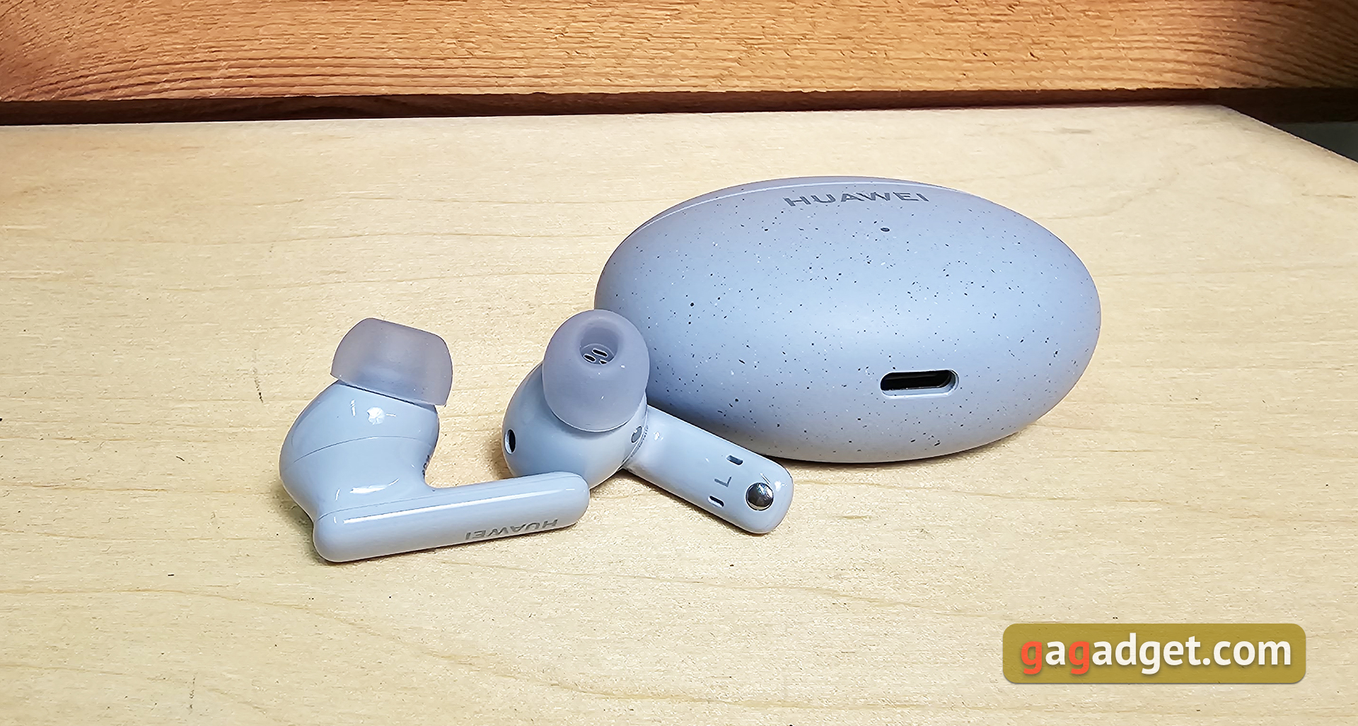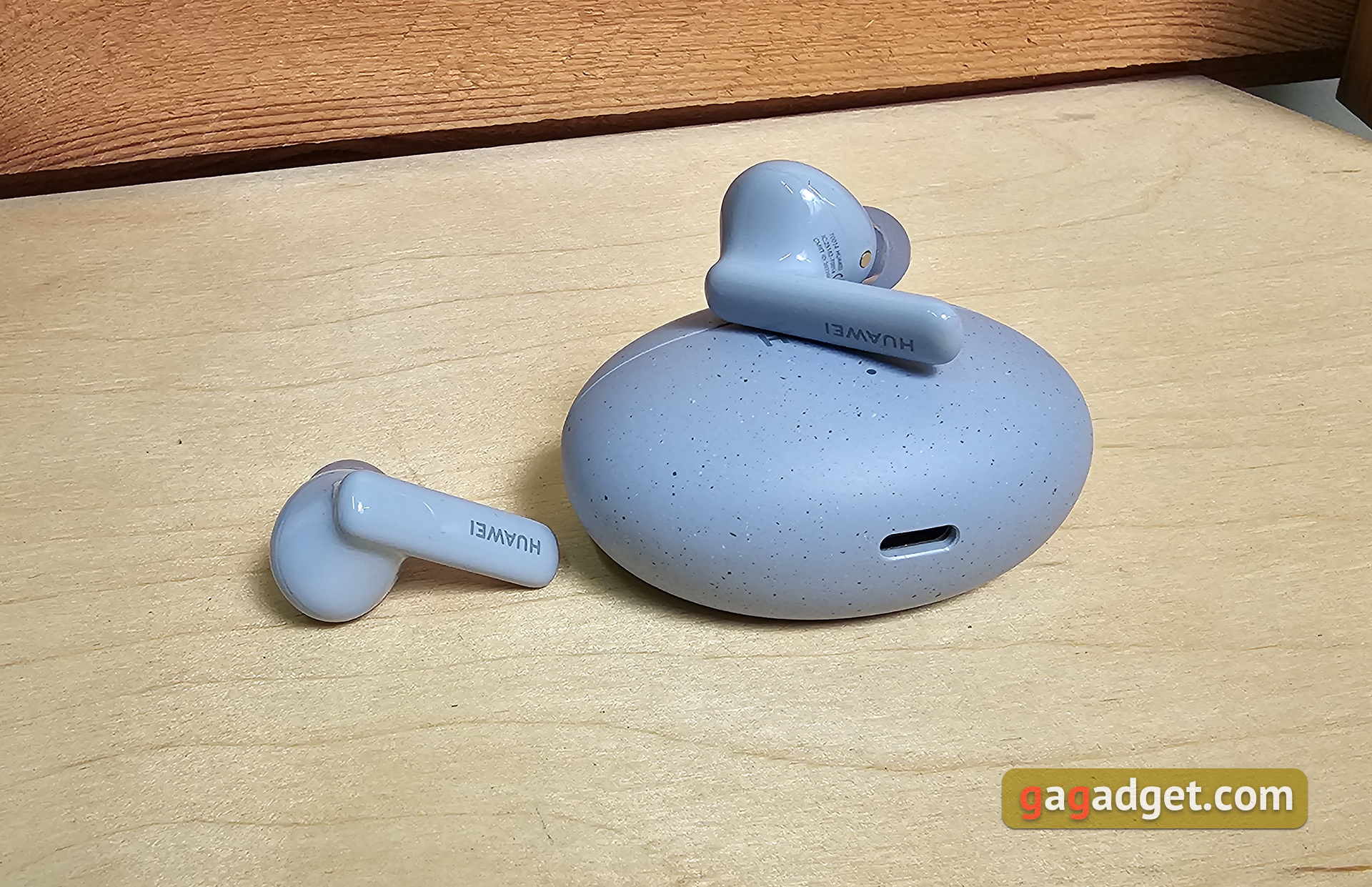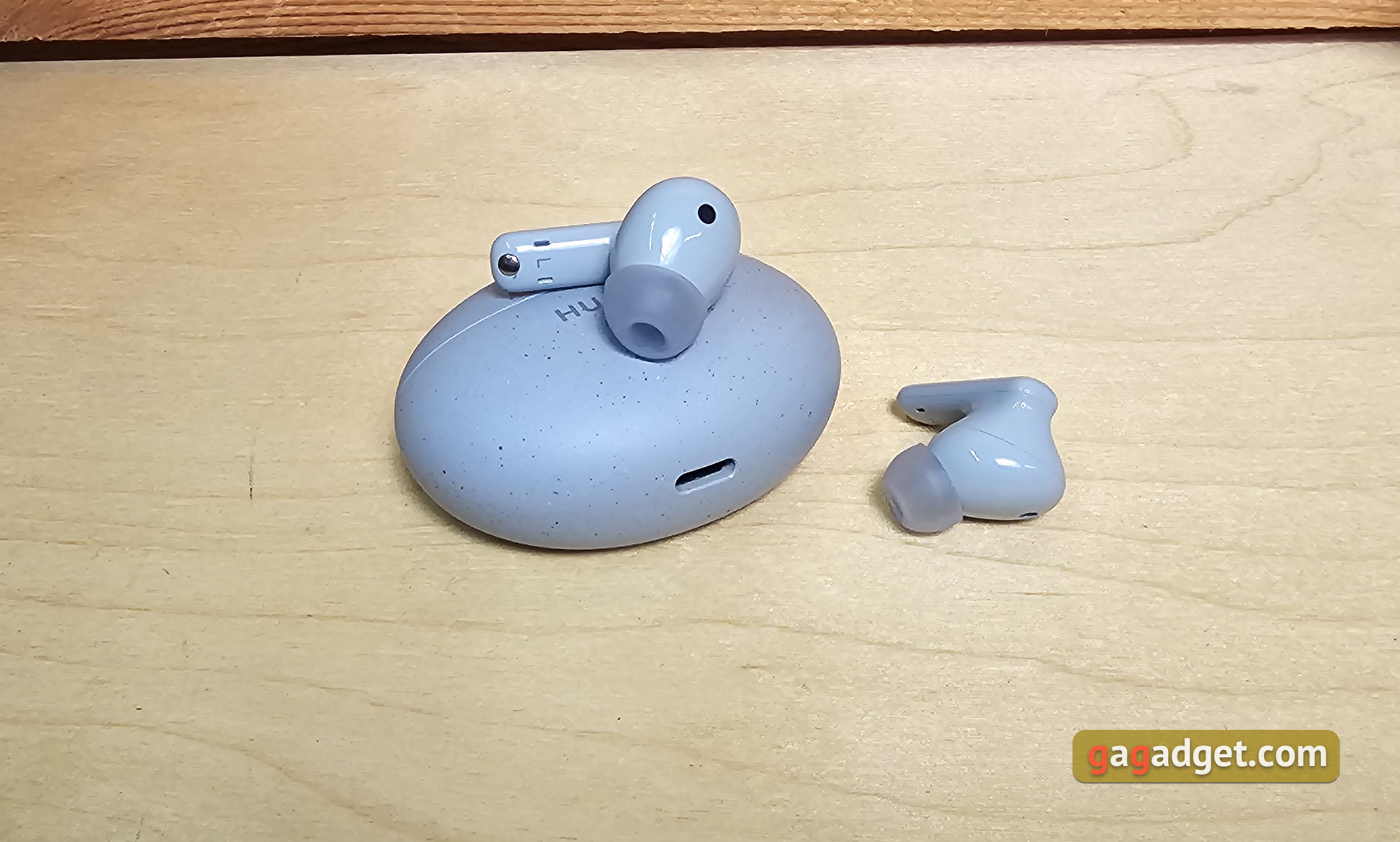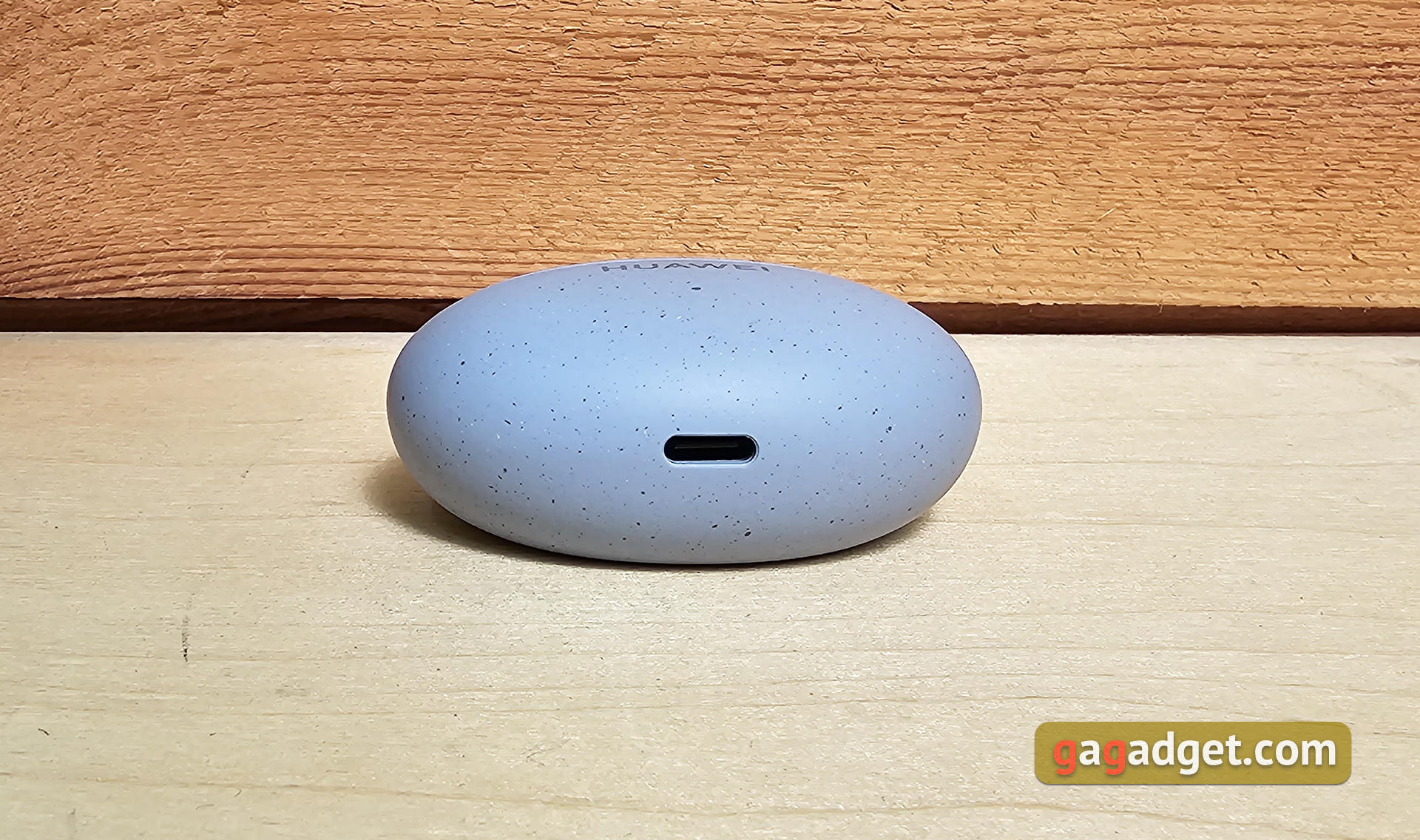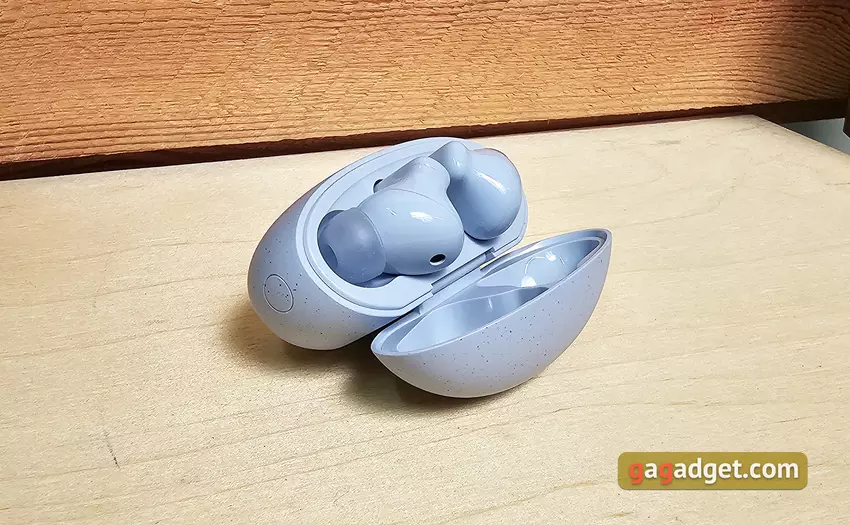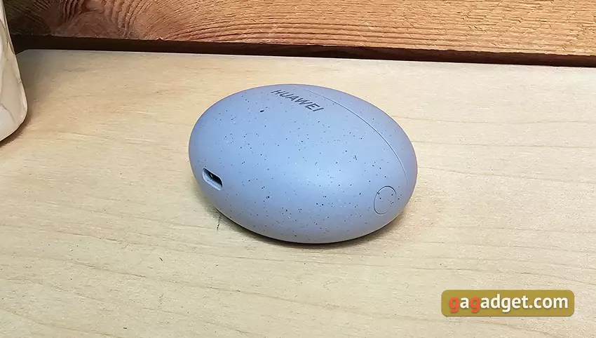 Etui do ładowania jest kompaktowe, owalne i płaskie. Waży zaledwie 33 g bez słuchawek. Można je dość wygodnie nosić w kieszeni, jest prawie niewidoczne. W niebieskiej wersji słuchawek etui ma przyjemną matową fakturę i małe ciemniejsze plamki. Dzięki temu przez długi czas będzie wyglądać schludnie. Na froncie znajduje się logo Huawei oraz wskaźnik LED informujący o trybie ładowania lub połączenia. Z boku znajduje się pojedynczy przycisk, który aktywuje tryb połączenia.