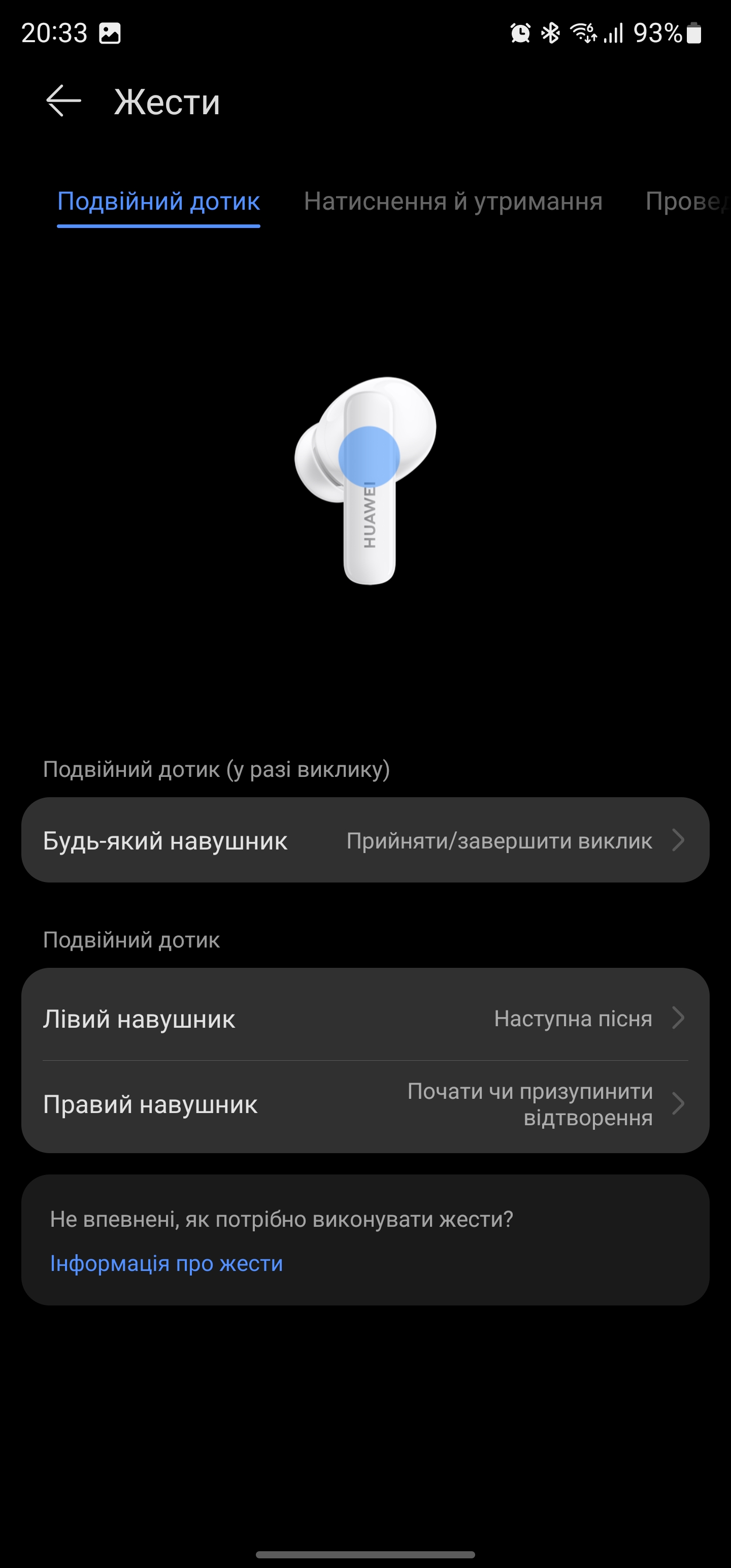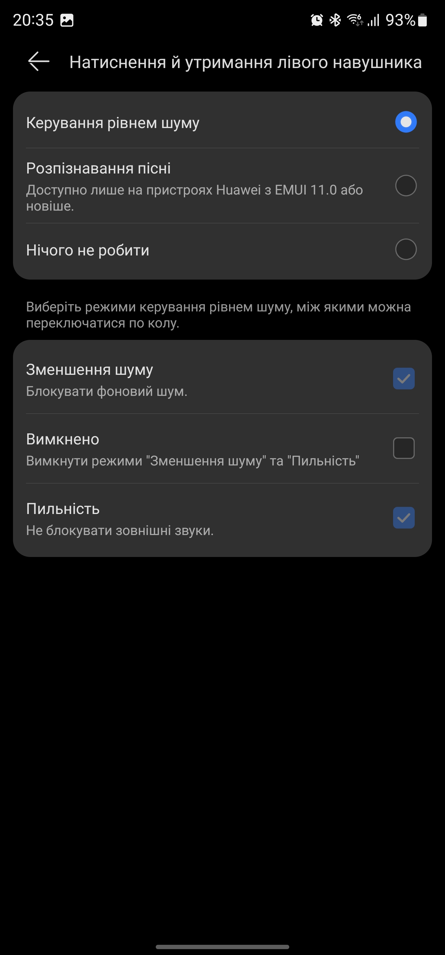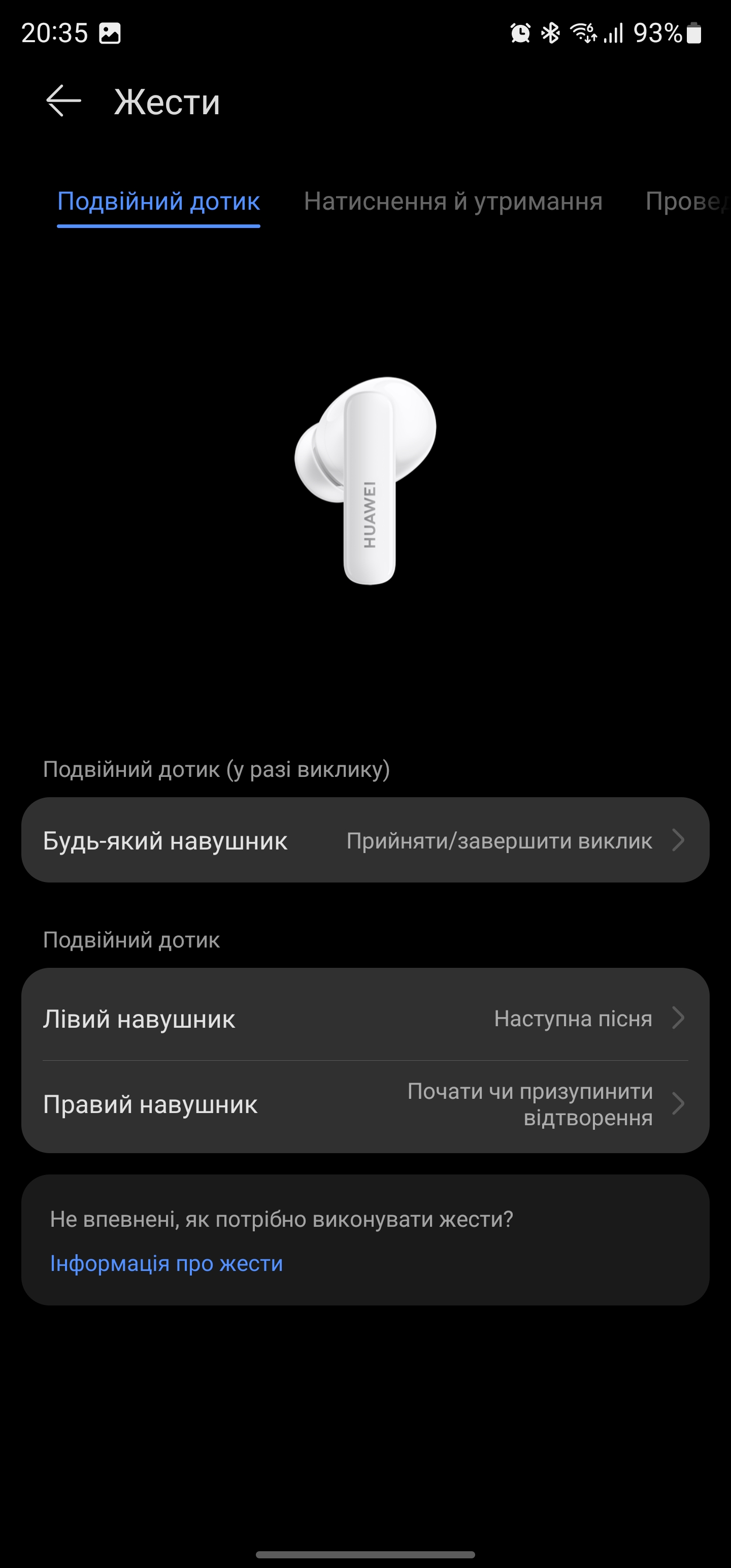 W przypadku Huawei FreeBuds 5i na nóżkach słuchawek znajdują się obszary dotykowe. Są one niewielkie, ale w ciągu dnia lub dwóch można się do nich przyzwyczaić i trafić dobrze za pierwszym razem. Domyślny schemat wygląda następująco. Podwójne stuknięcie w prawą słuchawkę odpowiada za wstrzymanie i odtwarzanie (lub przyjęcie/odrzucenie połączenia), a w lewą - przełączenie na następny utwór. Długie naciśnięcie powoduje przełączenie trybu redukcji szumów. Można również wybrać dwa z trzech trybów. Na przykład można przełączać się tylko między aktywną redukcją hałasu a trybem przezroczystości. Możesz również przypisać funkcję rozpoznawania ścieżek do długiego naciśnięcia. Działa ona jednak tylko ze smartfonami Huawei i tylko na EMUI 11 lub nowszym. Za regulację głośności odpowiada przesuwanie palcem w górę i w dół.