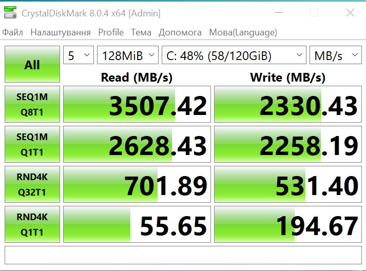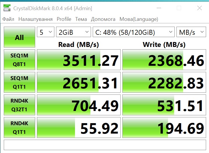 Dysk demonstruje jednak bardzo przyzwoitą prędkość działania: około 3500 MB/s podczas czytania i 2360 MB/s podczas pisania, co jest naprawdę rewelacyjny wynikiem w tym segmencie.