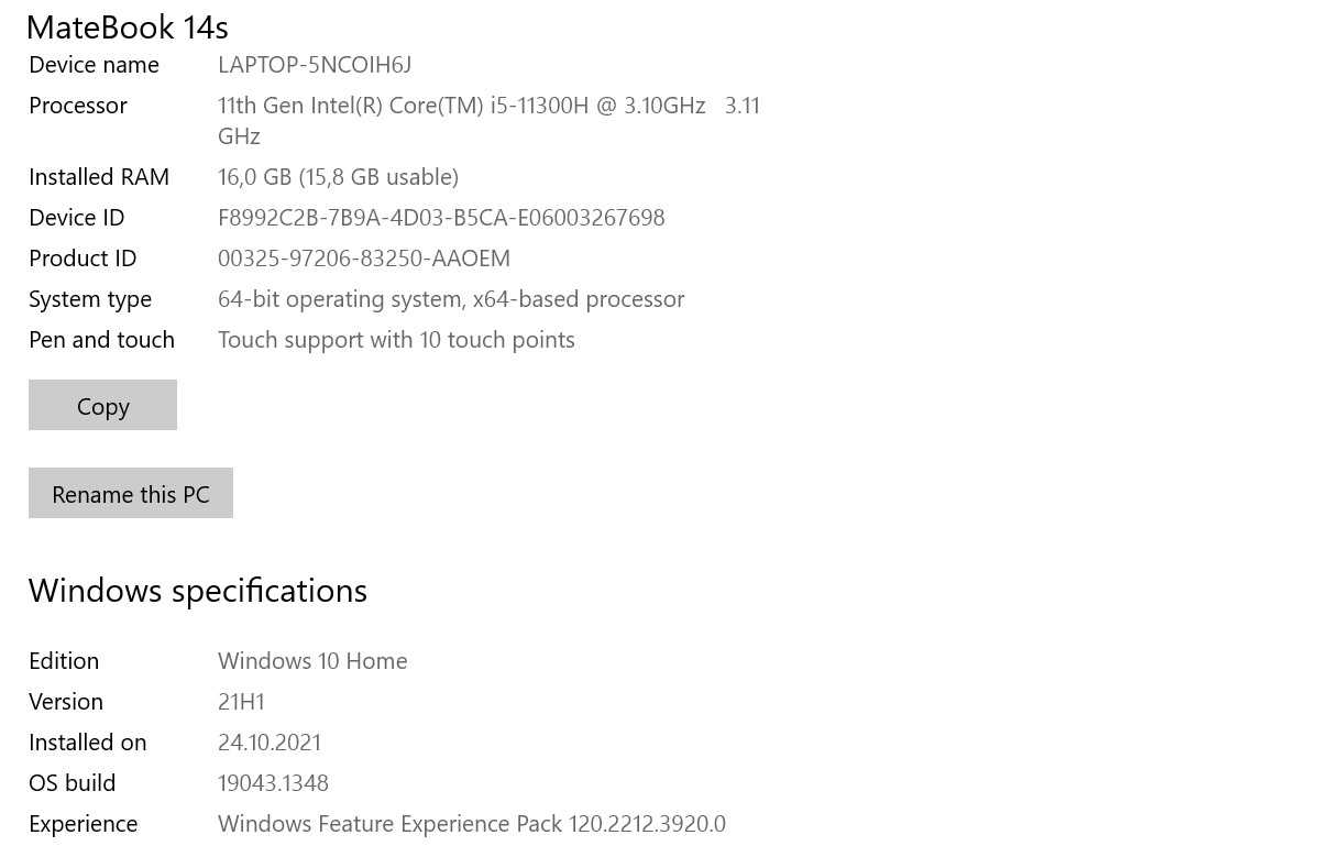 | Dane techniczne Huawei MateBook 14s | |