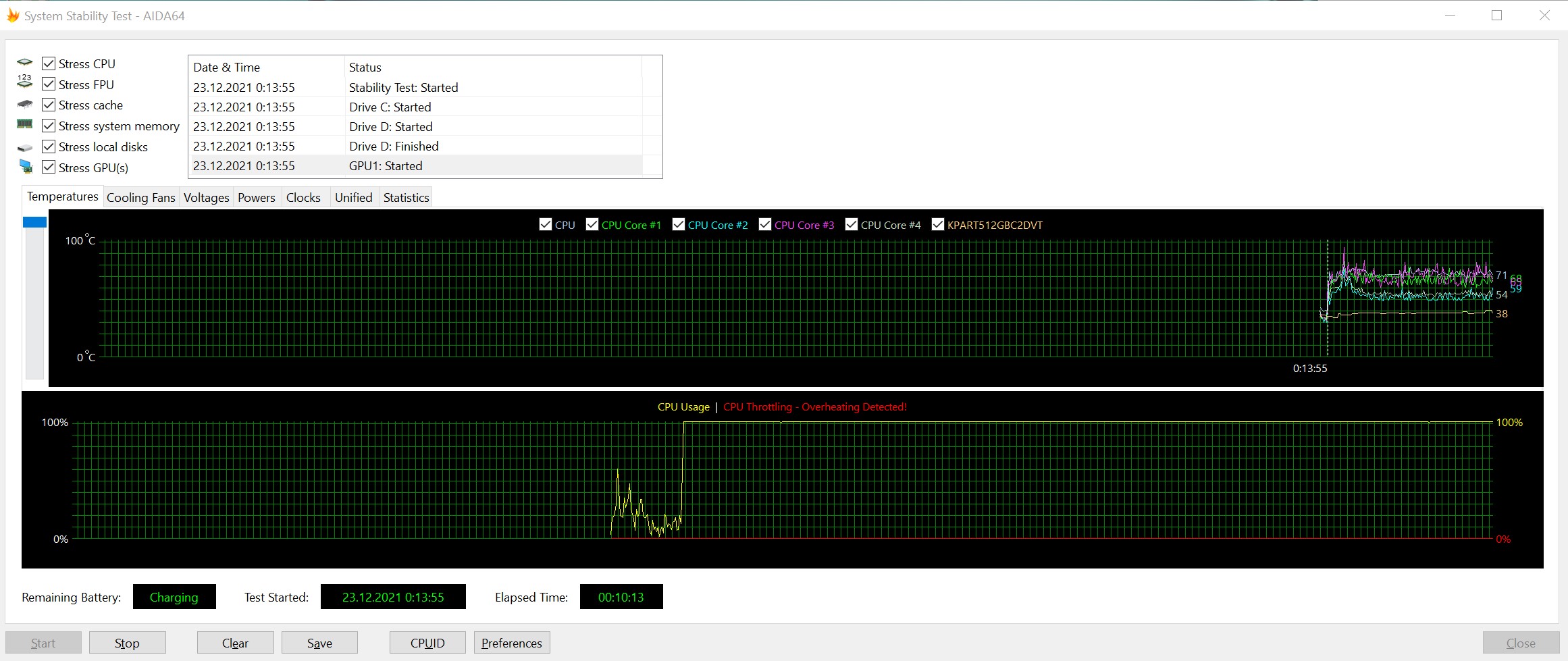 Za chłodzenie wnętrza odpowiada standardowy zestaw grzejników, rurek cieplnych i dwóch wentylatorów. Test obciążeniowy AIDA64 wykazał, że przy maksymalnym obciążeniu przez większość czasu temperatura podzespołów wyniesie około 70 °, więc nie ma problemu z trollingiem laptopa. Jednocześnie CO nie jest zbyt głośny, a przy minimalnym obciążeniu dźwięk eksploatacji w ogóle nie jest słyszalny. Etui również nie nagrzewa się bardzo: obszar klawiatury pozostaje zimny.