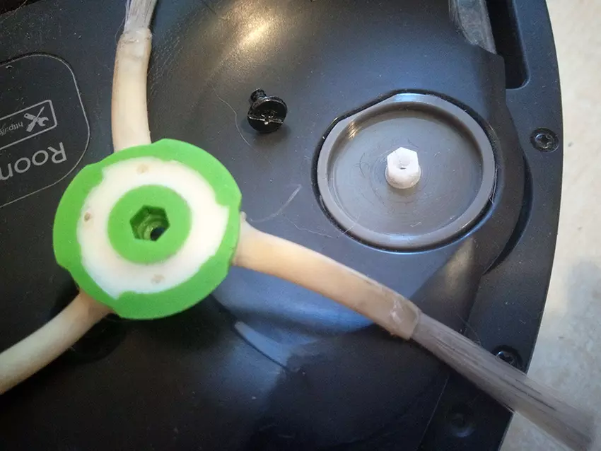 Najciekawsze w takich urządzeniach jest poniżej. Dysza odkurzacza znajduje się bliżej tylnej części dna, przed nią znajdują się dwa gumowe skrobaki o różnych kształtach, zbierające kurz i zanieczyszczenia w przeciwnym kierunku. Do czyszczenia w pobliżu ścian i narożników zbiera się obrotową szczotkę (tutaj jest sama), która podaje śmieci do dyszy. Symetrycznie do niej w zagłębieniu jest czujnik ruchu. Ruch i zwrotność zapewniają dwa duże koła (tak duże, jak pozwala na to wysokość obudowy) na elastycznym zawieszeniu i obrotowe koło z przodu. Tradycyjnie czujniki są umieszczone na spodzie obudowy, aby zapobiec spadnięciu odkurzacza ze schodów i innych wysokości oraz styków ładowania. Na dole kosza na śmieci znajduje się zielony gumowy zawór (o jego przeznaczeniu później).
