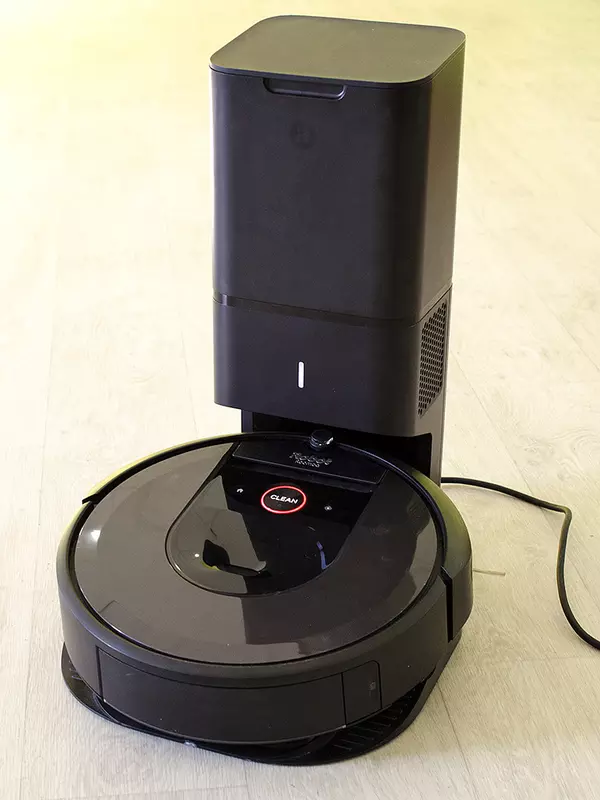 „Ciemna wieża” zawarta w zestawie, która jest tym samym „plusem” w nazwie modelu, w rzeczywistości zapewnia kluczową cechę Roomba i7 +, czyli możliwość niezależnego czyszczenia dużych powierzchni. W tym celu do stacji wbudowana jest nie tylko ładowarka, ale także potężna pompa i jednorazowy worek na śmieci zawierający zawartość 30 kolektorów śmieci. Gdy pojemnik na śmieci jest pełny, robot wraca do bazy, gdzie śmieci są pompowane przez ten sam zawór na dnie do worka w ciągu kilku sekund i możesz kontynuować pracę. Jeśli poziom naładowania baterii spadnie poniżej wartości krytycznej, robot wróci również do bazy i będzie kontynuował czyszczenie po naładowaniu. Korzystając z tej metody czyszczenia kosza na śmieci, nie musisz brudzić rąk i wdychać kurz, strząsając go ręcznie. Ale musisz kupować torby regularnie.