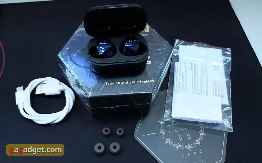 Kinera YH623 jest dostarczana w małym kartonowym pudełku o nietypowym sześciokątnym kształcie, który przypomina pudełko cukierków czekoladowych. W rzeczywistości wszystkie obecne modele Kinera są dostarczane w sześciokątnych pudełkach, tylko rozmiary są różne. Na pudełku jest sam obraz słuchawek i opis głównych funkcji. Zestaw jest prosty, ale jest tam wszystko, czego potrzebujesz: same słuchawki w futerale ładującym, 3 pary wymiennych nauszników o różnych rozmiarach, kabel USB Type-C do ładowania i dokumentacji. Standardowe instrukcje w języku chińskim i angielskim, ale sklep dodaje wersję w naszym języku.