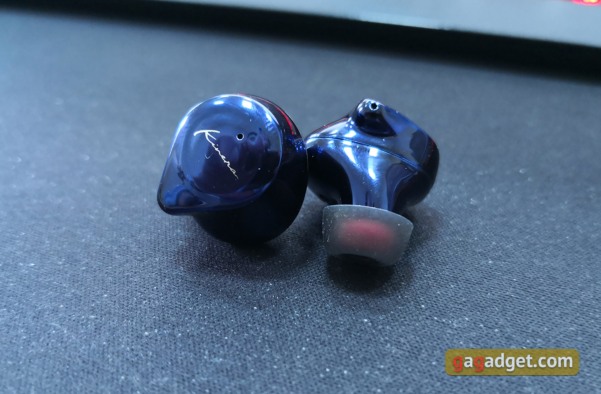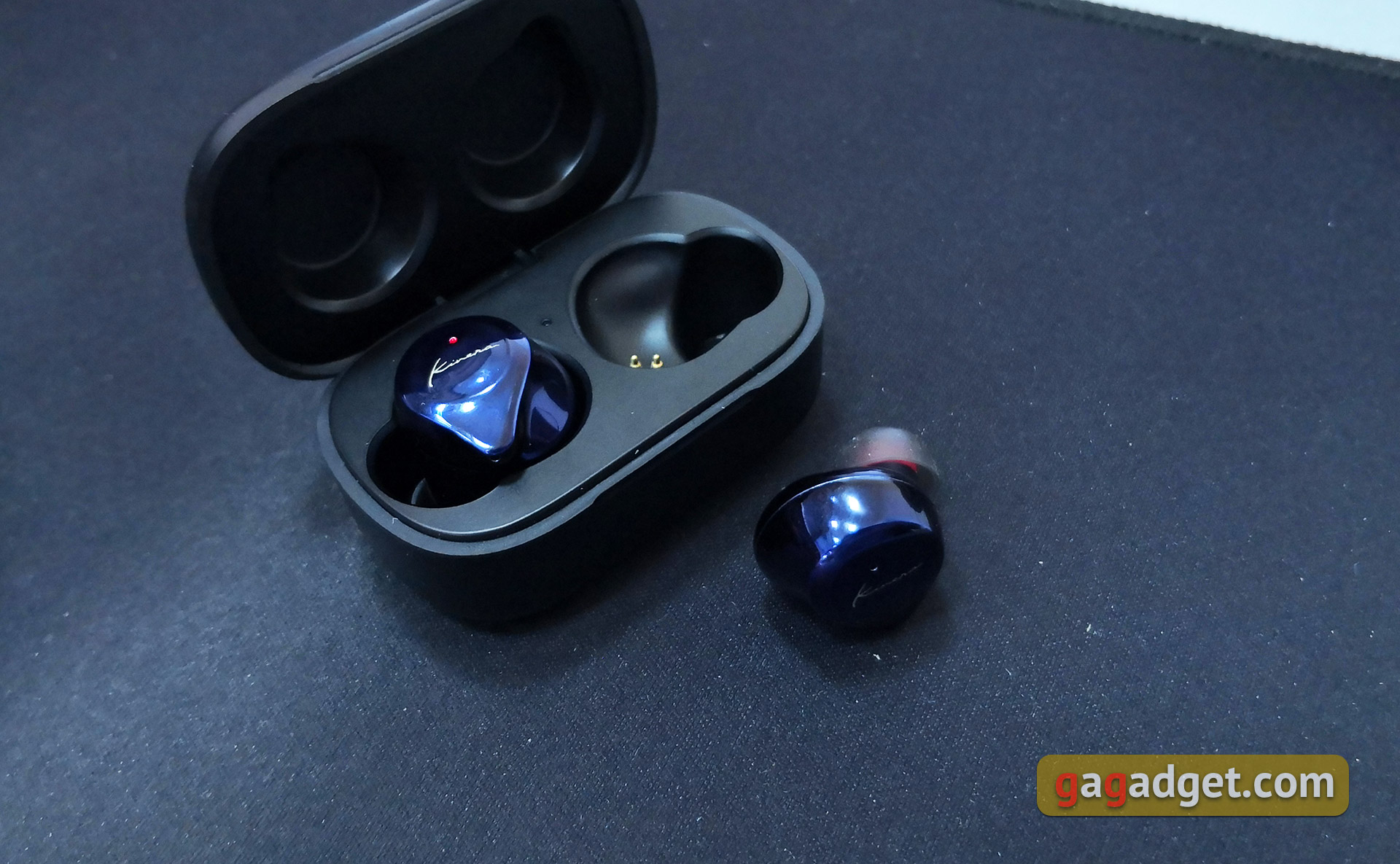 Kinera YH623 są wykonane z tworzywa sztucznego, w naszej wersji - błyszczące, piękne niebieskie. Wyglądają interesująco, ale bardzo dobrze zbierają odciski palców. Są jeszcze różowe. Zewnętrzna część słuchawek ma opływowy kształt kropli, w środku - logo Kinera, są też półki dotykowe do sterowania słuchawkami (na każdej słuchawce). Nad logo znajdują się wskaźniki LED dotyczące działania / ładowania.