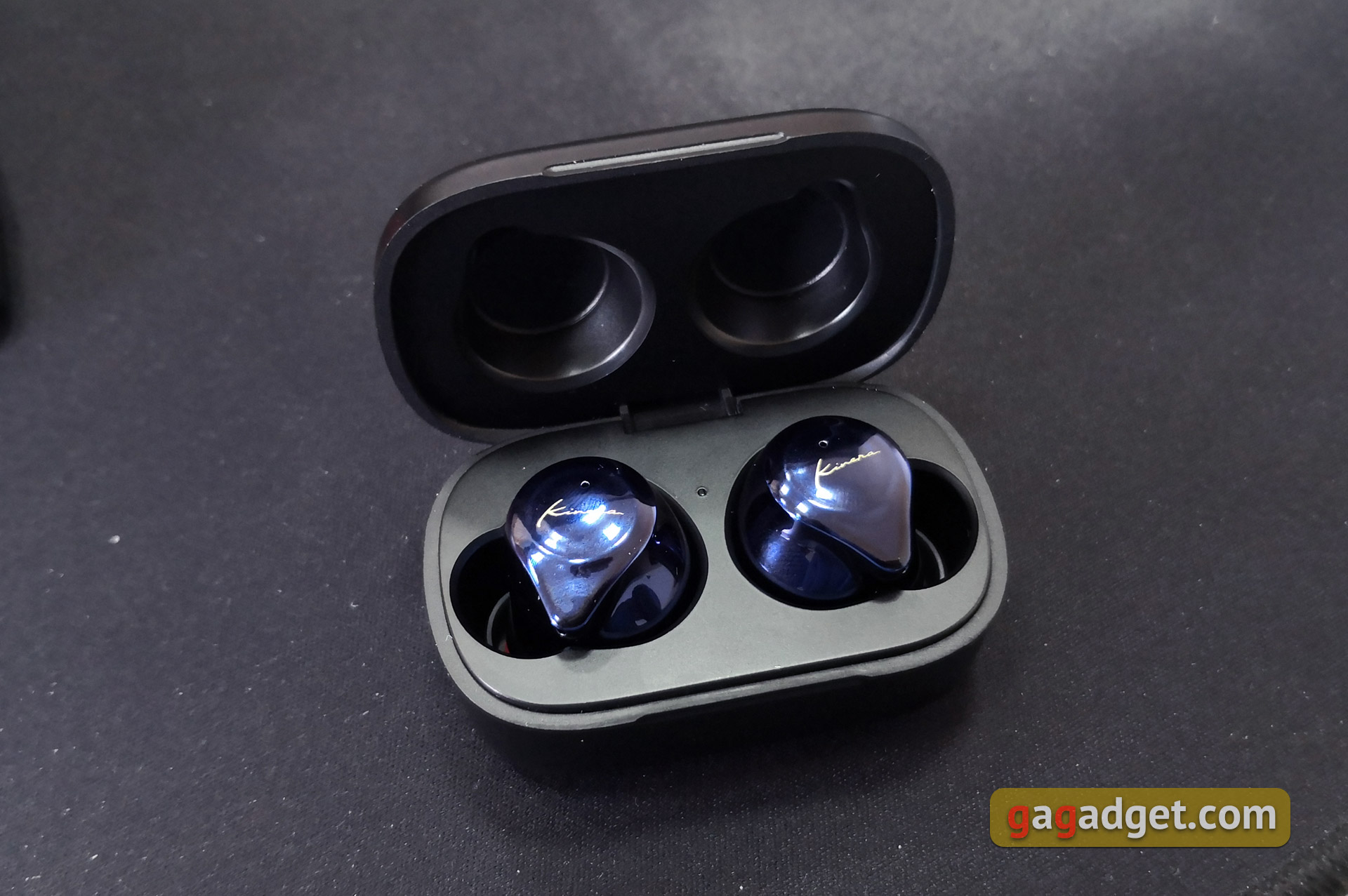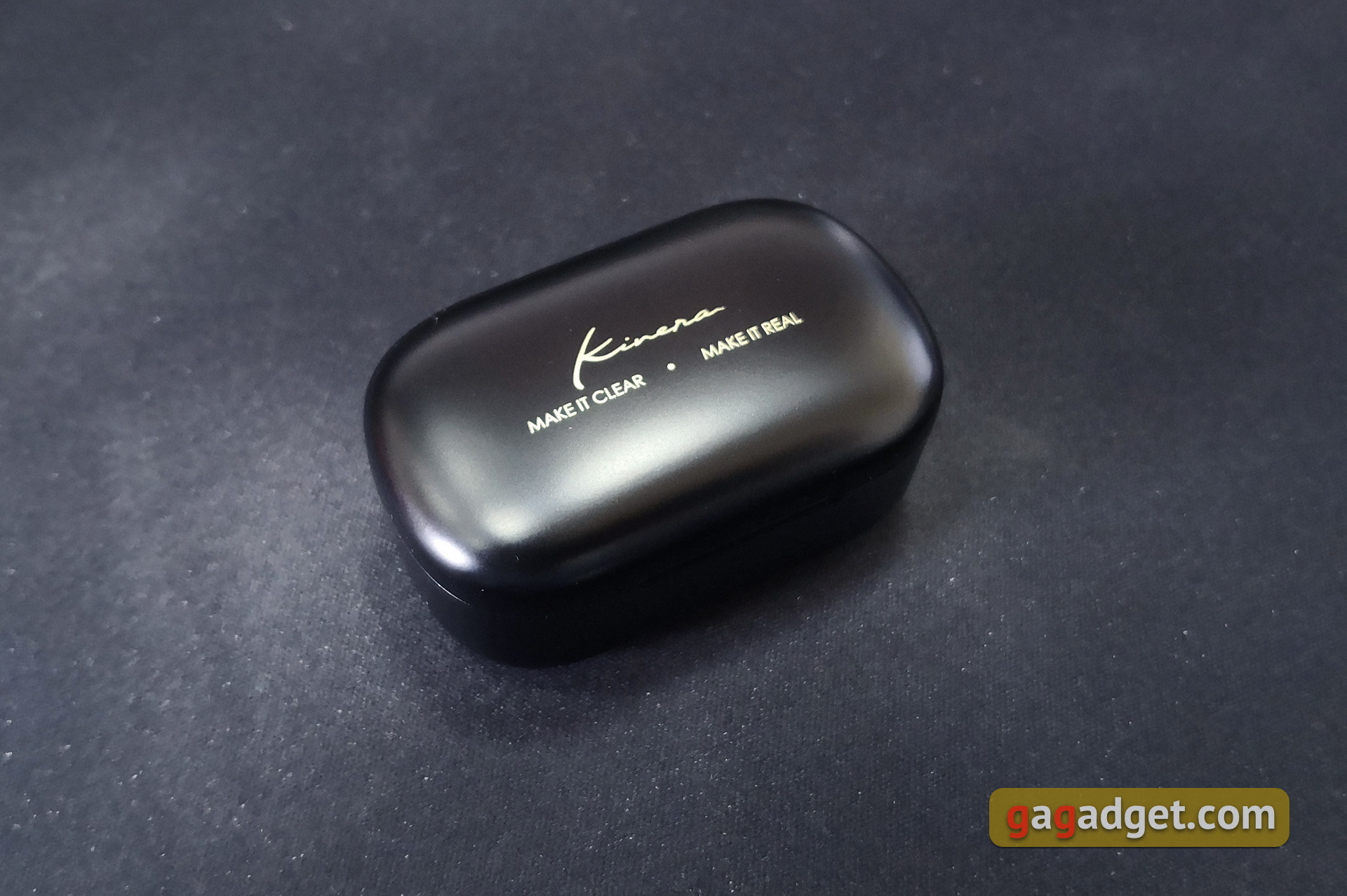 Futerał jest wykonany z ładnego czarnego plastiku. Powyżej logo Kinera. Futerał jest stosunkowo niewielki, opływowy, całkiem możliwe jest noszenie go w kieszeni odzieży wierzchniej. Na zewnątrz nie ma żadnych dodatkowych elementów funkcjonalnych. Wewnątrz, pomiędzy miejscami na słuchawki - jedyny wskaźnik LED: