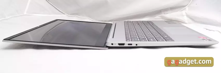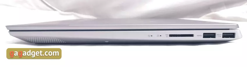 Grubość obudowy wynosi 17,9 mm, co jest dość normalne dla laptopa tej klasy. Po prawej stronie znajdują się wskaźniki LED, czytnik kart SD i dwa pełnowymiarowe USB 3.1 1Gen. Jeden z nich z obsługą ładowania, gdy laptop jest wyłączony. Jeden z głośników jest widoczny z przodu: jest skierowany pod kątem do dołu: