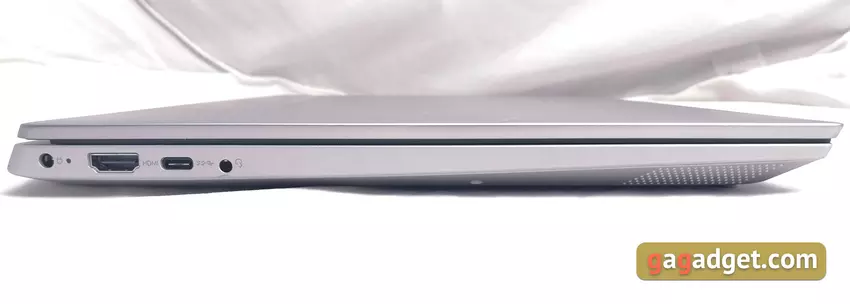 Po lewej stronie znajduje się gniazdo do podłączenia zasilacza, HDMI, połączone gniazdo audio 3,5 mm i jedno złącze USB Type-C 3.1 (Gen 1). Nie obsługuje wyświetlania obrazu ani zasilania. Tylko transfer danych.