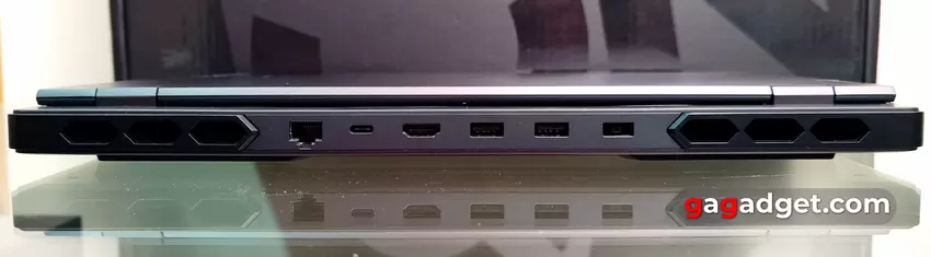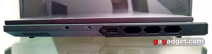 Na krawędziach znajduje się wiele dużych sześciokątnych otworów wentylacyjnych. Jest to całkiem normalne w przypadku potężnego modelu do gier. Jest też wiele złączy, które znajdują się po bokach i z tyłu. Po lewej stronie znajdują się USB-A 3.2 Gen 1 i USB-C 3.2 Gen 2 z obsługą DisplayPort 1.4 i 140W Power Delivery. Dzięki odpowiedniemu zasilaczowi można używać laptopa do pracy biurowej bez konieczności noszenia ze sobą dużego zasilacza o mocy 330 W. Ale oczywiście laptop nie będzie działał z pełną wydajnością.