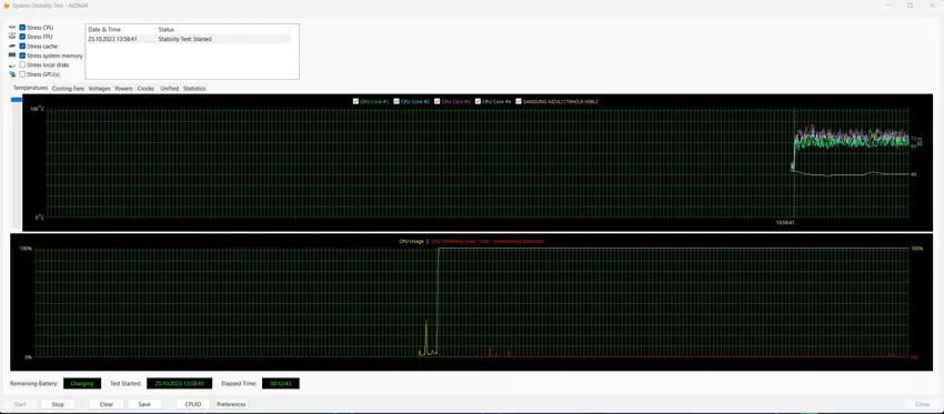 Za chłodzenie podzespołów odpowiada system Legion Coldfront 5.0, w skład którego wchodzą dwa wentylatory. Przy długotrwałym maksymalnym obciążeniu w teście obciążeniowym AIDA64 temperatura może wahać się w granicach 75-85°, procesor prawie w ogóle się nie dławi, a laptop działa stabilnie. Przy maksymalnym obciążeniu występuje hałas, ale nie jest to najgłośniejszy laptop do gier, jaki kiedykolwiek testowaliśmy. System chłodzenia nie krzyczy przez wbudowane głośniki. Klawiatura pozostaje chłodna, tylko obszar nad nią robi się trochę ciepły.