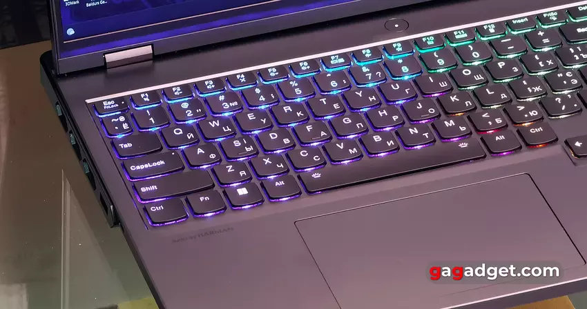 Klawiatura zajmuje prawie całą szerokość powierzchni roboczej i ma standardowy układ z dodatkowym blokiem numerycznym. Jedyną osobliwością układu jest zmniejszony rozmiar przycisków funkcyjnych, który kończy się na przyciskach sterowania multimediami. Blok strzałek jest pełnowymiarowy i nieco przesunięty bliżej użytkownika. Oba klawisze Shift są długie. Nie ma więc prawie żadnych nietypowych momentów, a przyzwyczajenie się do nich zajmuje minimum czasu. Przycisk zasilania z wbudowaną diodą LED znajduje się nad klawiaturą. Z jakiegoś powodu Lenovo zdecydowało się całkowicie zrezygnować z biometrycznych metod odblokowywania laptopa w Legion Pro 7. Nie ma czujnika linii papilarnych ani kamery na podczerwień.