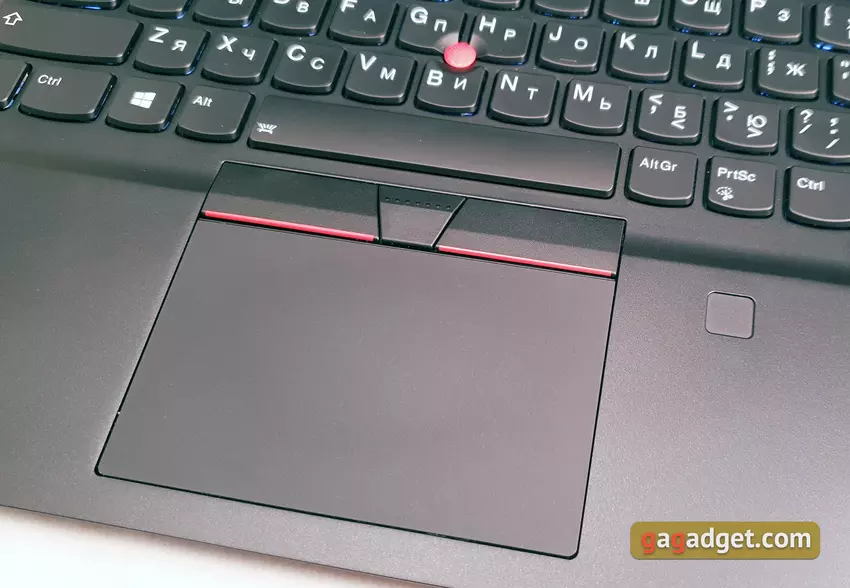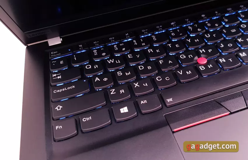 Zawiasy pozwalają otworzyć laptop o 180 ° i dobrze zamocować ekran we właściwej pozycji. Jednocześnie laptop otwiera się bez problemów jedną ręką. Układ klawiatury i elementów funkcjonalnych jest znany z poprzednich ThinkPadów: przycisk zasilania jest okrągły, z diodą LED. Umieszczony nad klawiaturą. Skaner linii papilarnych znajduje się po prawej stronie touchpada, zgubił diodę LED. Górny rząd przycisków F ma nieco zmniejszoną wysokość, na końcu wiersza znajdują się osobne przyciski Początek, Koniec i Usuń. PgUp i PgDn znajdują się po bokach strzałki w górę, a PrtSc znajduje się między prawymi przyciskami Alt i Ctrl. Trackpoint znajduje się między przyciskami G, H i B, a nad touchpadem znajdują się trzy dodatkowe przyciski. Co jest trochę denerwujące - Fn i Ctrl zmieniły miejsca, takie rozwiązanie było od dawna stosowane w ThinkPad. Ale wcześniej ich przyznaczenie można było zmienić za pomocą Lenovo Vantage, teraz z jakiegoś powodu postanowili usunąć tę możliwość. Nie jest to krytyczne, ale przyzwyczajenie się do tego będzie potrzebne: