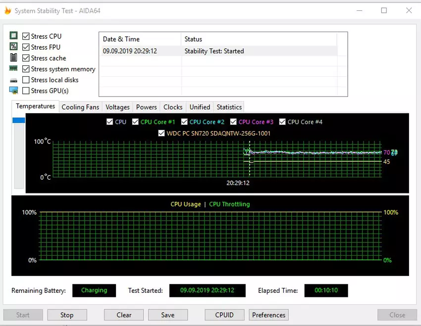 Układ chłodzenia w laptopie był bardzo udany. Radzi sobie ze swoim zadaniem i nie hałasuje. W biurze hałas jest całkowicie nieodczuwalny, w ciszy słychać wentylator, ale poziom hałasu jest więcej niż komfortowy. Przy przedłużonym maksymalnym obciążeniu temperatura wnętrzności pozostaje na poziomie 70 °. Oczywiście nie obserwuje się dławienia: