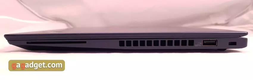 Po lewej stronie znajdują się dwa USB Type-C 3.1: jeden z obsługą Power Delivery do ładowania za pomocą diody LED, a drugi z obsługą Thunderbolt 3. Drugi Type-C znajduje się obok zastrzeżonego portu Ethernet, w jednej wspólnej wnęce, do której można podłączyć zastrzeżoną stację dokującą. Niestety w zestawie nie ma adaptera do standardowego RJ-45, a byłby bardzo przydatny w biznesowym laptopie. Następny jest pełnowymiarowy USB 3.0 i HDMI: