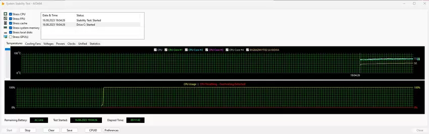 Za chłodzenie odpowiadają dwa miniaturowe wentylatory, które są słyszalne przy maksymalnym obciążeniu. Hałas nie jest jednak ani głośny, ani irytujący. System chłodzenia spełnia swoje zadanie. Pod obciążeniem podzespoły nagrzewają się do około 75°, a system działa stabilnie bez spadku wydajności.