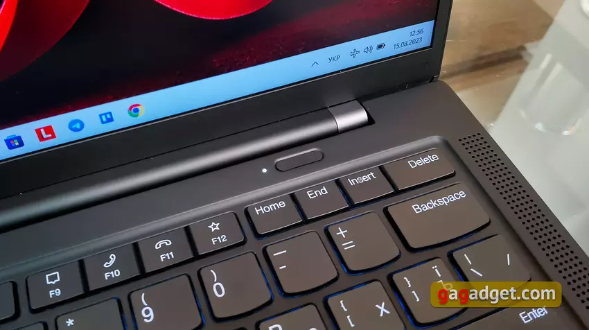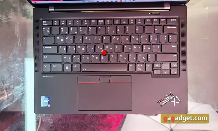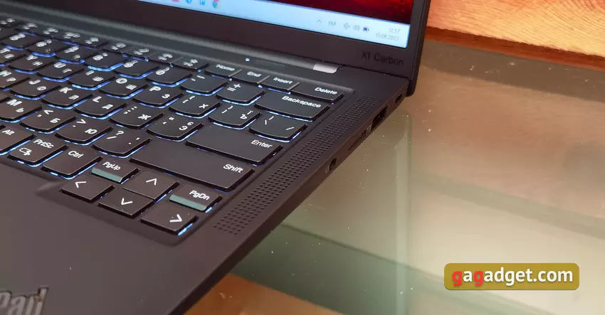 Klawiatura jest lekko zagłębiona w powierzchni roboczej. Po bokach znajdują się głośniki, chociaż nie wpłynęło to na układ, jest to absolutnie standardowe dla linii Lenovo ThinkPad X1 Carbon, więc wszystko będzie znane koneserom. A dla tych, którzy właśnie zdecydowali się przejść na ThinkPada, będzie kilka rzeczy do przyzwyczajenia. Na końcu górnego rzędu znajdują się osobne przyciski Home, End i Delete, blok strzałek jest lekko przesunięty w stronę użytkownika, a przyciski PgUp i PgDn są umieszczone po bokach strzałki w górę. PrtSc znajduje się pomiędzy prawymi przyciskami Alt i Ctrl. I tradycyjna funkcja: Fn i lewy Ctrl zostały zamienione miejscami. Można to jednak skonfigurować w aplikacji Lenovo Vantage.
