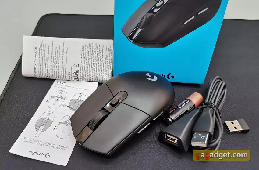 Logitech G305 jest zapakowany w małe niebieskie pudełko. Przód i tył - przyzwoita ilość informacji o zaletach myszy. Wewnątrz - sama mysz, odbiornik USB, przedłużacz 1,5 m USB 2.0, bateria AA Duracell i dokumentacja.
