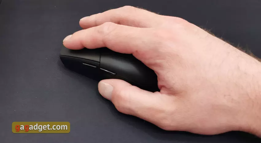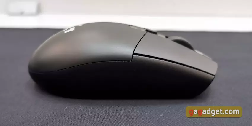Kształt myszy jest bardzo podobny do Logitech G Pro lub G102. Jest symetryczny, mały. Formalnie nadaje się do prawej i lewej ręki, ale dodatkowe przyciski są tylko po jednej stronie. Są one wykonane z błyszczącego plastiku i znacznie wystają ponad powierzchnię myszy, nie grzechotają i nie zataczają się. Oddzielenie między nimi jest bardzo wyraźne.