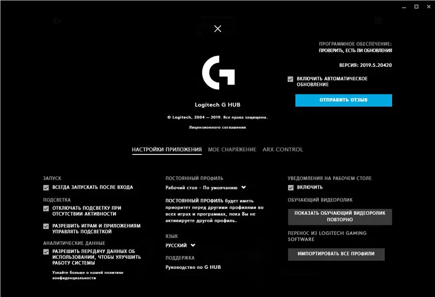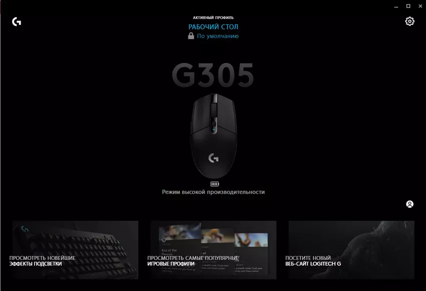 Podstawowa zmiana wartości DPI może być przełączana bez oprogramowania, a ponadto istnieje wewnętrzna pamięć, która umożliwia jednorazową regulację myszy i nie powraca do tego problemu. Do skonfigurowania możesz użyć starego, znanego oprogramowania Logitech Gaming Software, ale wydaje się, że firma stopniowo je porzuca. Pojawiła się już nowa aplikacja Logitech G HUB, która ogólnie ma podobną funkcjonalność, ale jest nieco inaczej zorganizowana i wygląda znacznie bardziej nowocześnie. Główny ekran wyświetla urządzenia, aktualny profil, są przyciski do przechodzenia do ustawień aplikacji, konto (opcjonalne do przechowywania profili w chmurze) i trzy linki do oficjalnej strony: