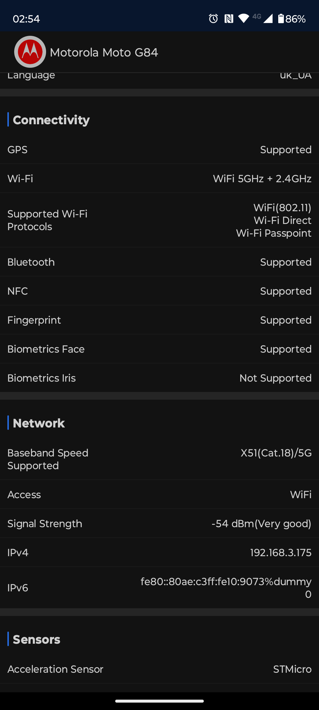 Motorola Moto G84 posiada dwuzakresowe Wi-Fi 802.11 a/b/g/n/ac, Bluetooth 5.1 LE i NFC do płatności zbliżeniowych. Obsługa globalnych systemów pozycjonowania: GPS, A-GPS, LTEPP, Glonass, Galileo, Beidou, QZSS. Dźwięk stereo jest odtwarzany przez głośniki główne i słuchawkowe, podobnie jak w zdecydowanej większości nowoczesnych smartfonów. Margines głośności nie jest zły, podobnie jak jakość dźwięku jak na niedrogi smartfon. Chociaż, podobnie jak większość smartfonów, prawie nie ma niskich częstotliwości. Obsługiwany jest wirtualny dźwięk przestrzenny Dolby Atmos.