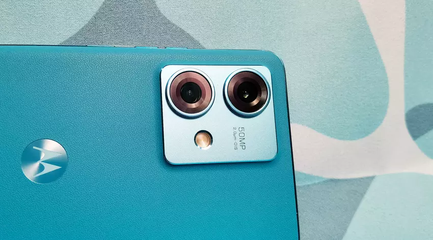 Tylny panel wykonany jest z tak zwanej ekoskóry. Jest miękka, bardzo przyjemna w dotyku i ma fakturę. Powierzchnia nie zbiera odcisków palców i nie jest tak śliska jak wersje plastikowe i szklane. Na środku tylnej obudowy znajduje się logo Motoroli, a poniżej logo Pantone z nazwą odpowiadającego mu koloru. Do recenzji otrzymaliśmy bardzo ciekawą niebieską wersję. Jest też jasna z zielonkawym odcieniem i bardziej klasyczna czarna.