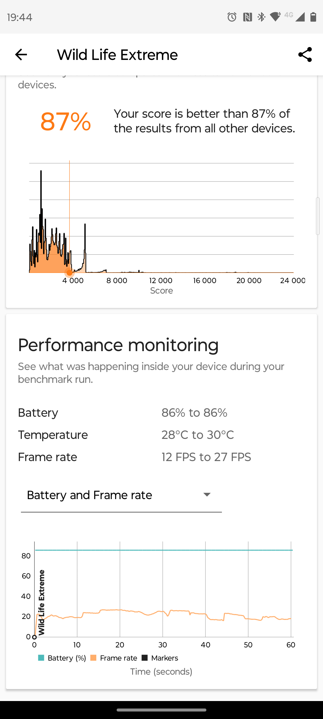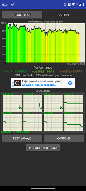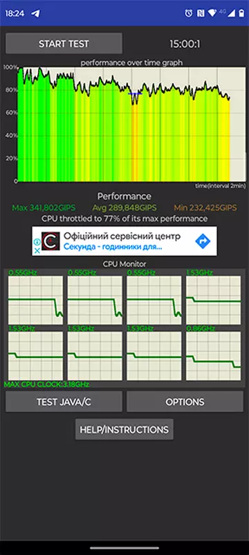 Ale stabilność nie jest zbyt dobra. Przy maksymalnym obciążeniu w teście dławienia procesora wydajność spada do 77% w ciągu 15 minut. W tym samym czasie obudowa staje się zauważalnie ciepła. Chociaż, biorąc pod uwagę znaczny margines wydajności, niemożliwe jest tak duże obciążenie procesora w rzeczywistych zadaniach. Po 10 minutach grania w Diablo Immortal, obudowa pozostała tylko ciepła i nie było żadnych problemów z wydajnością.